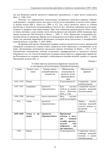 Статья посвящена изучению вопроса о социальном положении ромейской знати в Ахейском княжестве в 1204-1262 гг. На основании анализа текстов трех версий «Морейской хроники», свидетельств Жоффруа де Виллардуэна, Анри де Валансьена, Георгия Акрополита, Георгия Пахимера, Марино Санудо Торчелло и иных источников автор выявляет особенности процесса интеграции архонтов в новую общественную структуру, созданную франками. Делается вывод о том, что наложение военной обязанности на ἄρχοντες происходило в том случае, если ее исполнение было для них традиционным (милинги) или необходимым завоевателям (монемвасиоты). Обращается внимание на отсутствие прямых подтверждений тому, что служба влекла за собой «автоматическое» включение архонтов в группу вассалов «простого оммажа». Констатируется, что первые свидетельства участия представителей греческой элиты в походах латинян и начала ограниченной интеграции знатных ромеев в рыцарское сословие приходятся на 1260-е гг., а их массовое участие в битве при Пелагонии 1259 г. не подтверждается ни одним источником. Отмечается, что в рамках стандартных договоренностей о переходе под власть западных европейцев, в которых ἄρχοντες именовали себя слугами (δοῦλοι) франков, благородные греки исполняли консультативные и административные функции, а также, вероятно, могли оказывать князю временную военную поддержку. Соглашение монемвасиотов и Гийома II де Виллардуэна, в свою очередь, можно трактовать не только как подтверждение возникновения вассально-ленных отношений между завоевателями и завоеванными или распространения наемничества во франкской Морее, но и как заключение фьеф-рентного договора.