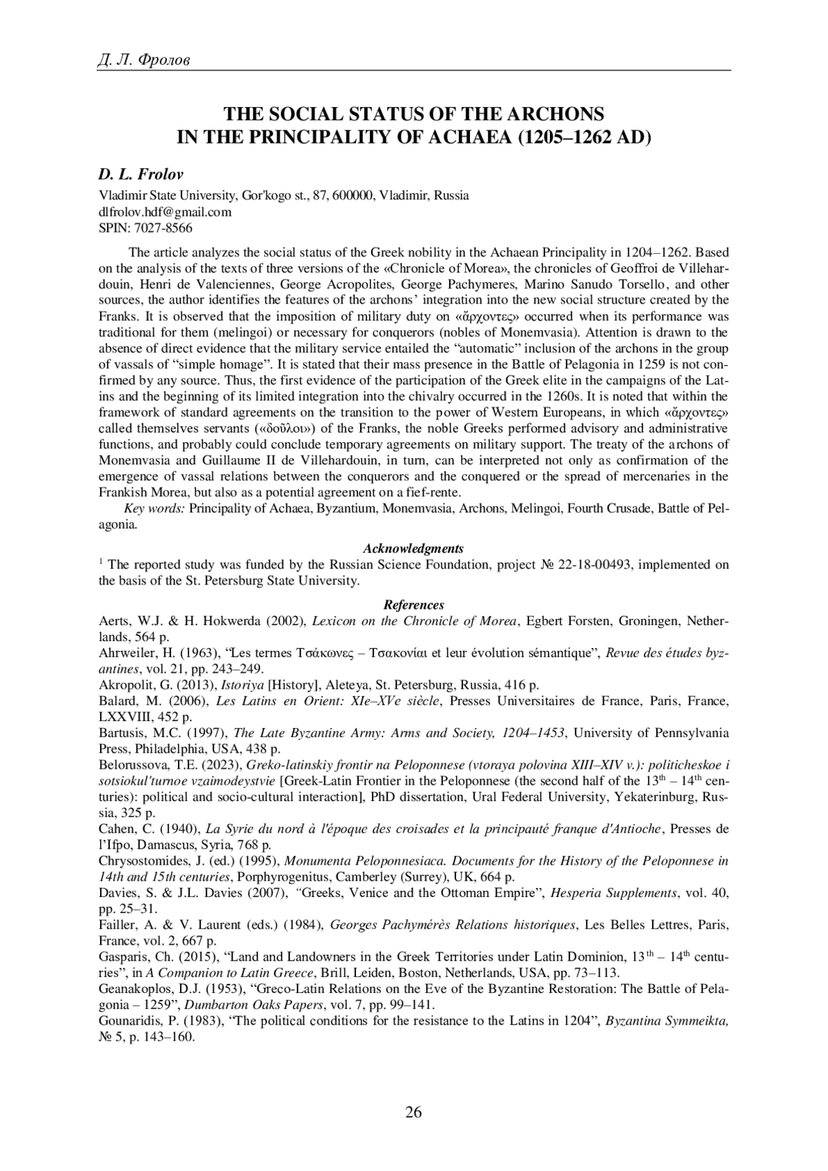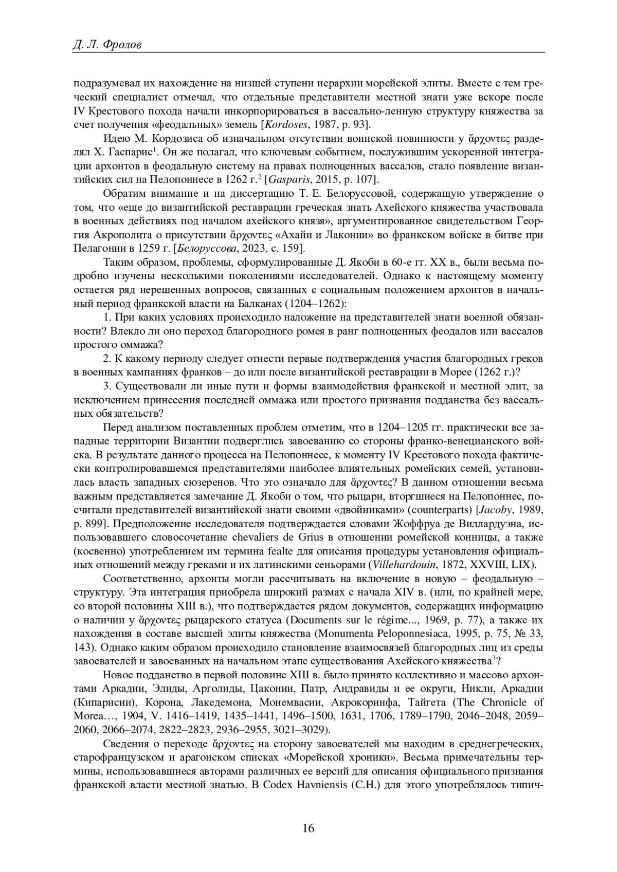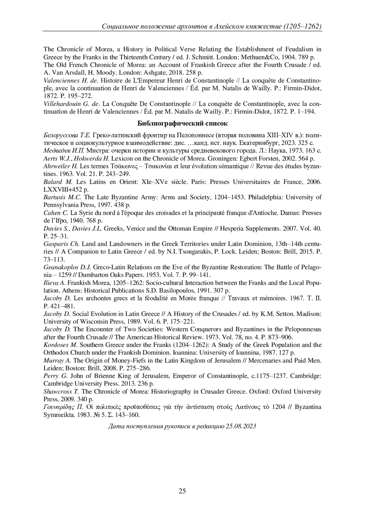 1. Белоруссова Т.Е. Греко-латинский фронтир на Пелопоннесе (вторая половина XIII-XIV в.): политическое и социокультурное взаимодействие: дис. …канд. ист. наук. Екатеринбург, 2023. 325 с. EDN: MBOGLL