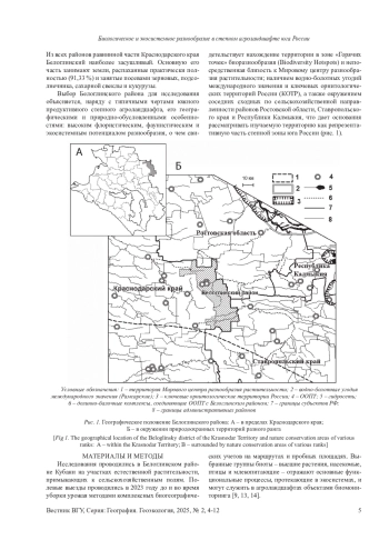 Цель работы - оценить биологическое и экосистемное разнообразие степных агроландшафтов с высокой долей пахотных земель на примере Белоглинского района Краснодарского края для разработки природоохранных подходов и мероприятий. Материалы и методы. Полевые исследования проводились в 2023 году с использованием маршрутных флористических и фаунистических учетов, геоботанических описаний, регистрации визуальных встреч и следов жизнедеятельности животных. При обработке материала использовались региональные Красные книги, картографическое моделирование, дистанционное зондирование (ДЗЗ) и геоинформационные (ГИС) технологии. Результаты и обсуждение. Впервые проведено комплексное биогеографическое исследование и картографирование природных экосистем степного сельскохозяйственного ландшафта. Большинство сохранившихся фрагментов (лесные и степные массивы, поймы и склоны речных долин, заросшие овраги и балки, лесополосы, межи, пустоши) занимают не более 7 % территории, но выполняют разнообразные экологические роли: биоценотическую, рефугиумную, буферную, транзитную. Являясь характерными ландшафтными элементами степного агроценоза, они наряду с памятниками природы поддерживают разнообразие сообществ растений и животных, включая редкие виды, и могут составить основу экологической сети региона. Выводы. Экологические подходы и малозатратные меры по сохранению биоразнообразия в сельскохозяйственном ландшафте юга России были разработаны на основе картографических моделей трех крупномасштабных уровней (регионального, базового и локального). Они применимы в степных и лесостепных сельскохозяйственных регионах России.
