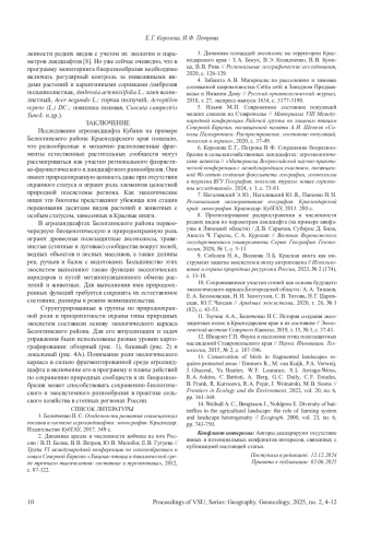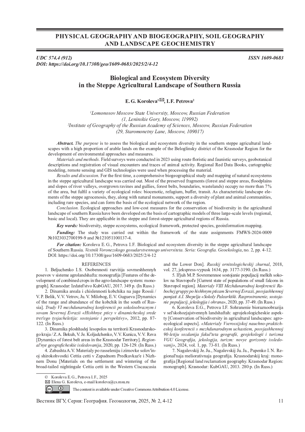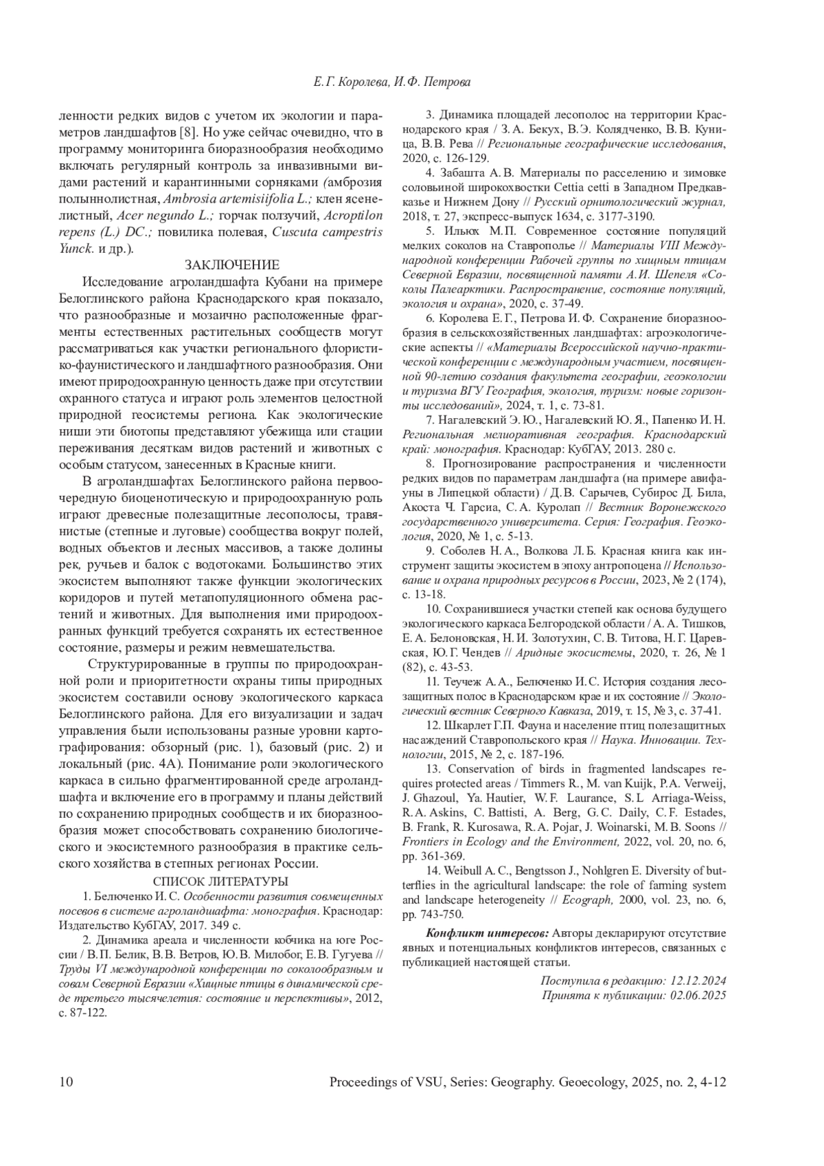 6. 	Королева Е. Г., Петрова И. Ф. Сохранение биоразнообразия в сельскохозяйственных ландшафтах: агроэкологические аспекты // “Материалы Всероссийской научно-практической конференции с международным участием, посвященной 90-летию создания факультета географии, геоэкологии и туризма ВГУ География, экология, туризм: новые горизонты исследований”, 2024, т. 1, с. 73-81. EDN: MRTADK