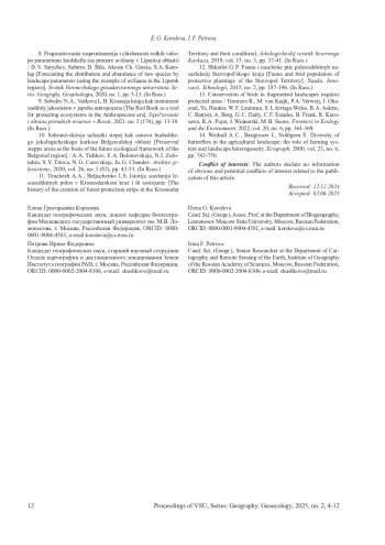 10. 	Сохранившиеся участки степей как основа будущего экологического каркаса Белгородской области / А. А. Тишков, Е. А. Белоновская, Н. И. Золотухин, С. В. Титова, Н. Г. Царевская, Ю. Г. Чендев // Аридные экосистемы, 2020, т. 26, № 1 (82), с. 43-53. EDN: CXBIPQ