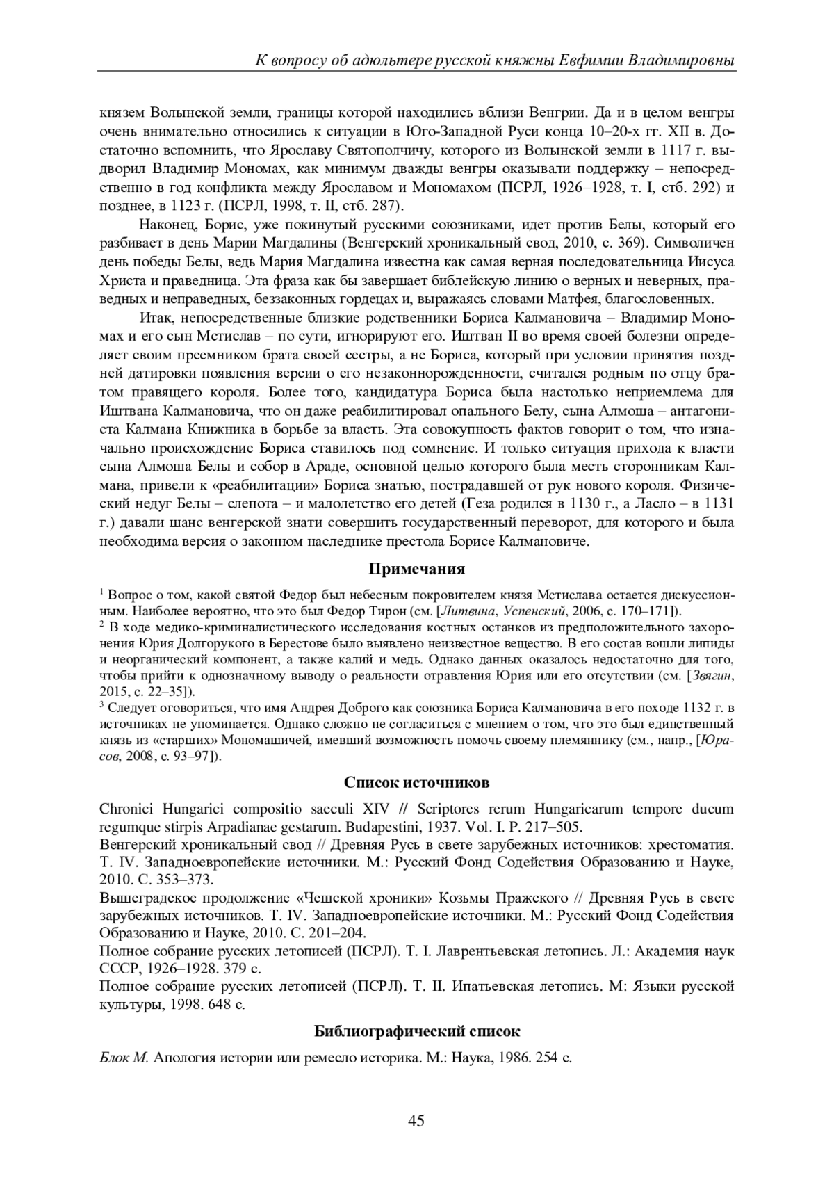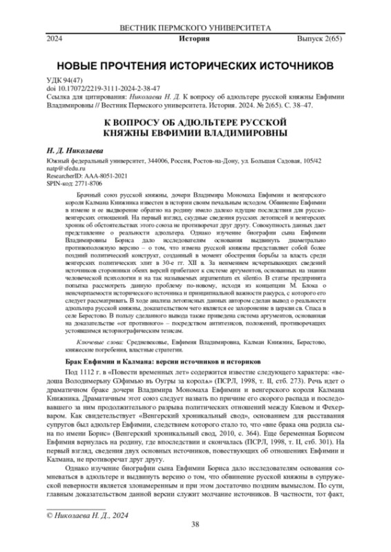 Брачный союз русской княжны, дочери Владимира Мономаха Евфимии и венгерского короля Калмана Книжника известен в истории своим печальным исходом. Обвинение Евфимии в измене и ее выдворение обратно на родину имело далеко идущие последствия для русско-венгерских отношений. На первый взгляд, скудные сведения русских летописей и венгерских хроник об обстоятельствах этого союза не противоречат друг другу. Совокупность данных дает представление о реальности адюльтера. Однако изучение биографии сына Евфимии Владимировны Бориса дало исследователям основания выдвинуть диаметрально противоположную версию - о том, что измена русской княжны представляет собой более поздний политический конструкт, созданный в момент обострения борьбы за власть среди венгерских политических элит в 30-е гг. XII в. За неимением исчерпывающих сведений источников сторонники обеих версий прибегают к системе аргументов, основанных на знании человеческой психологии и на так называемых argumentum ex silentio. В статье предпринята попытка рассмотреть данную проблему по-новому, исходя из концепции М. Блока о неисчерпаемости исторического источника и принципиальной важности ракурса, с которого его следует рассматривать. В ходе анализа летописных данных автором сделан вывод о реальности адюльтера русской княжны, доказательством чего является ее захоронение в церкви св. Спаса в селе Берестово. В пользу сделанного вывода также приведена система аргументов, основанная на доказательстве «от противного» - посредством антитезисов, положений, противоречащих устоявшимся историографическим тезисам.