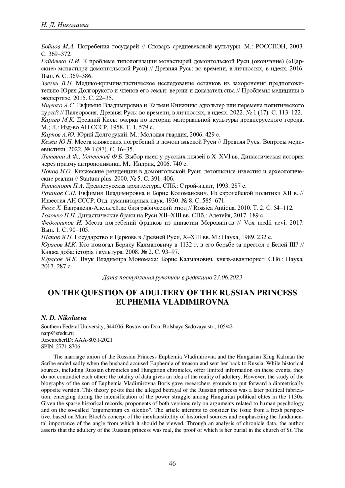 5. Ищенко А.С. Евфимия Владимировна и Калман Книжник: адюльтер или перемена политического курса? // Палеоросия. Древняя Русь: во времени, в личностях, в идеях. 2022. № 1 (17). С. 113-122.