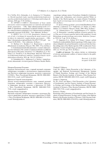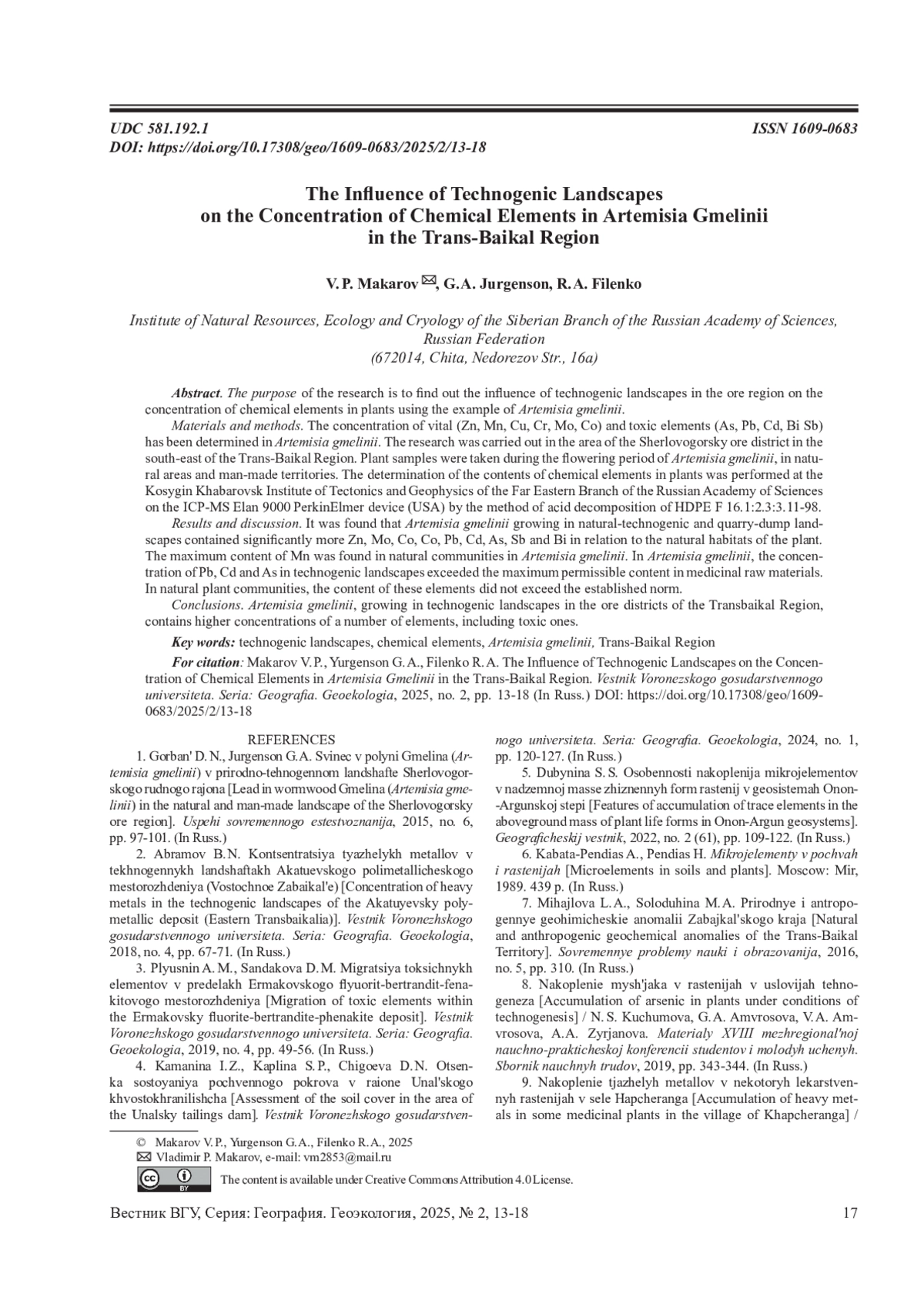 2. Абрамов Б. Н. Концентрация тяжелых металлов в техногенных ландшафтах Акатуевского полиметаллического месторождения (Восточное Забайкалье) // Вестник Воронежского государственного университета. Серия: География. Геоэкология, 2018, № 4, с. 67-71. EDN: YRVSOT