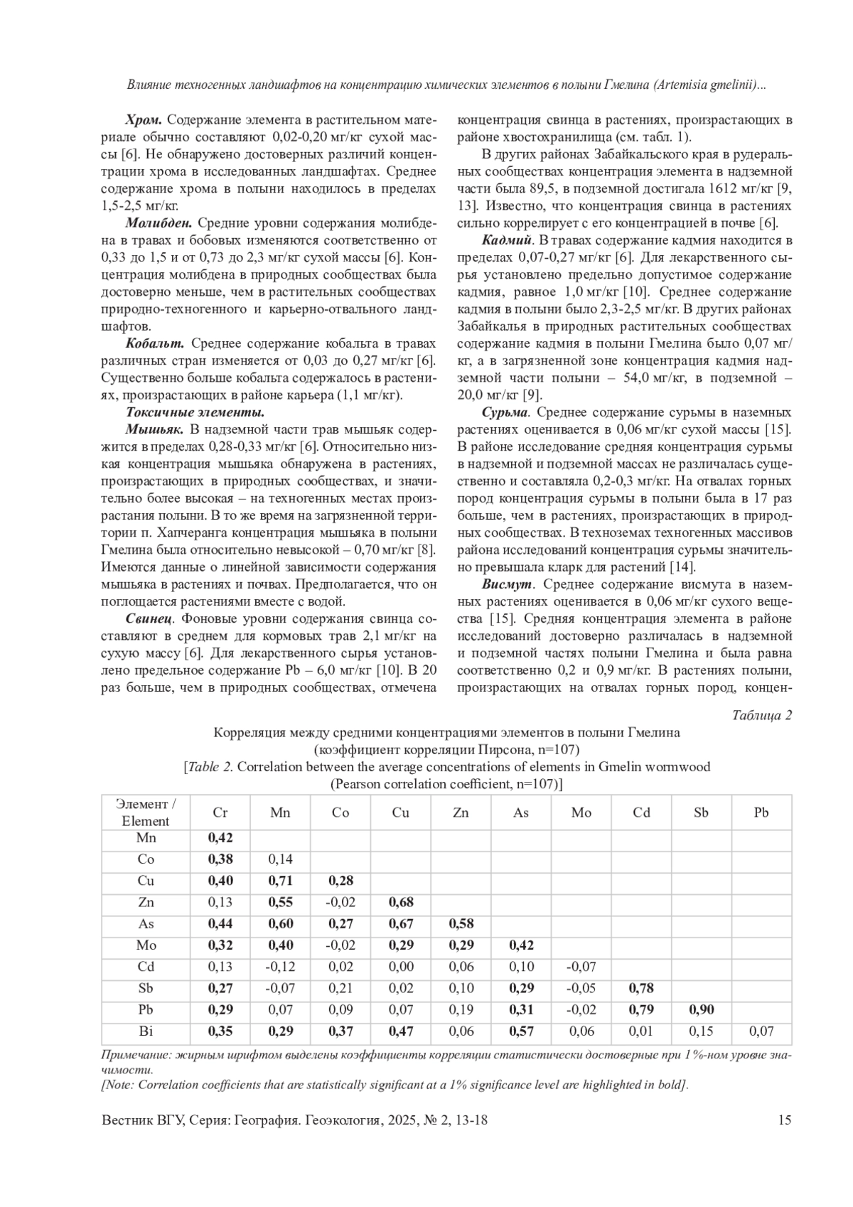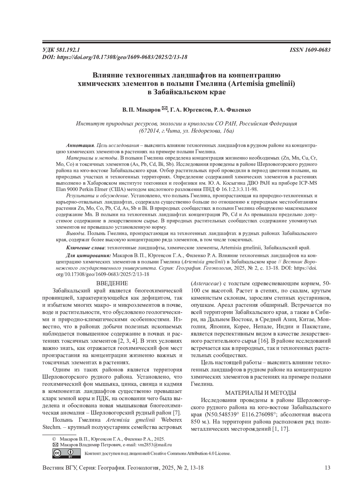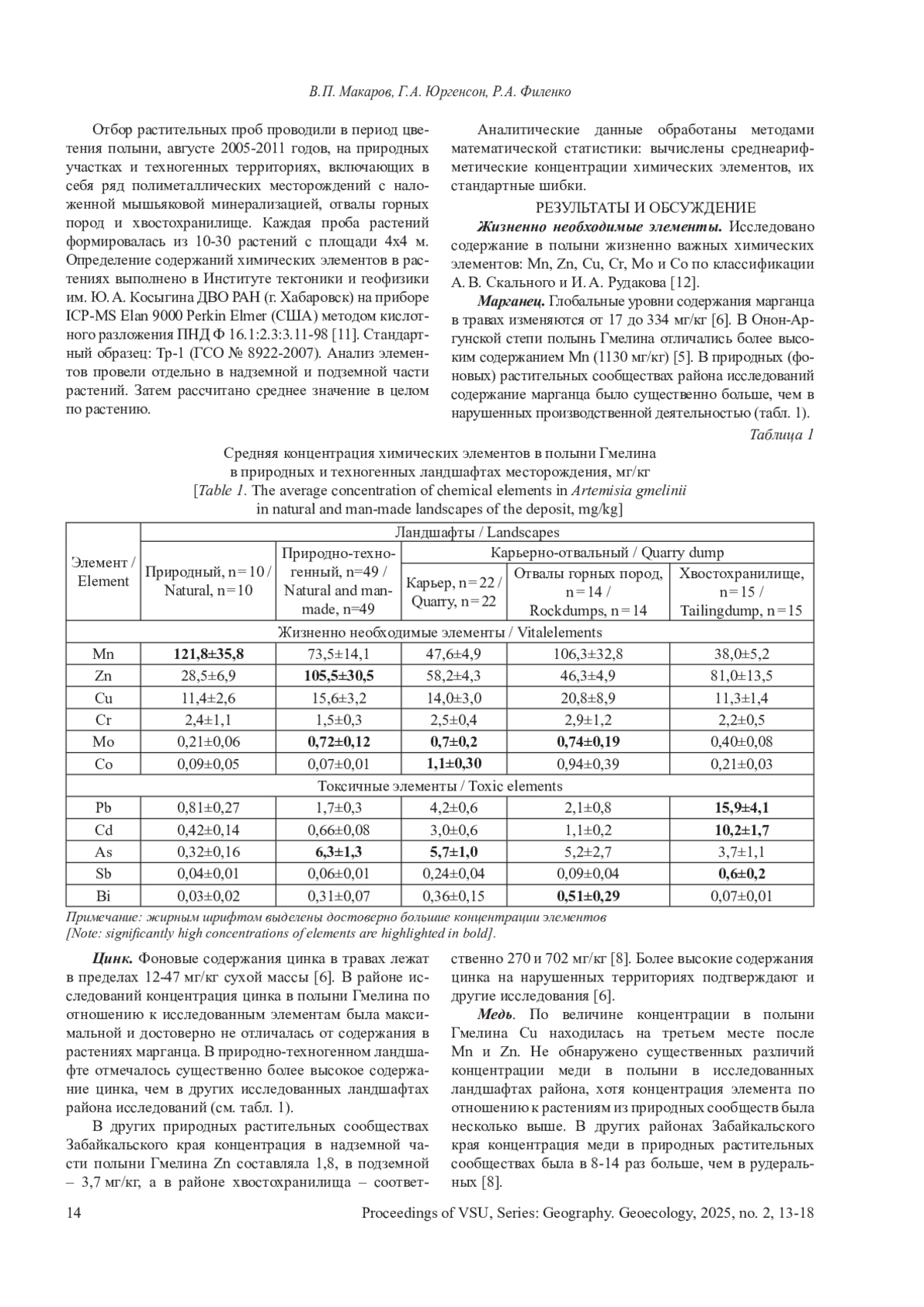 Ксичных элементов (As, Pb, Cd, Bi, Sb). Исследования проведены в районе Шерловогорского рудного района на юго-востоке Забайкальского края. Отбор растительных проб проводили в период цветения полыни, на природных участках и техногенных территориях. Определение содержаний химических элементов в растениях выполнено в Хабаровском институте тектоники и геофизики им. Ю. А. Косыгина ДВО РАН на приборе ICP-MS Elan 9000 Perkin Elmer (США) методом кислотного разложения ПНД Ф 16.1:2.3:3.11-98. Результаты и обсуждение. Установлено, что полынь Гмелина, произрастающая на природно-техногенных и карьерно-отвальных ландшафтах, содержала существенно больше по отношению к природным местообитаниям растения Zn, Mo, Co, Pb, Cd, As, Sb и Bi. В природных сообществах в полыни Гмелина обнаружено максимальное содержание Mn. В полыни на техногенных ландшафтах концентрация Pb, Cd и As превышала предельно допустимое содержание в лекарственном сырье. В природных растительных сообществах содержание упомянутых элементов не превышало установленную норму. Выводы. Полынь Гмелина, произрастающая на техногенных ландшафтах в рудных районах Забайкальского края, содержат более высокую концентрацию ряда элементов, в том числе токсичных.