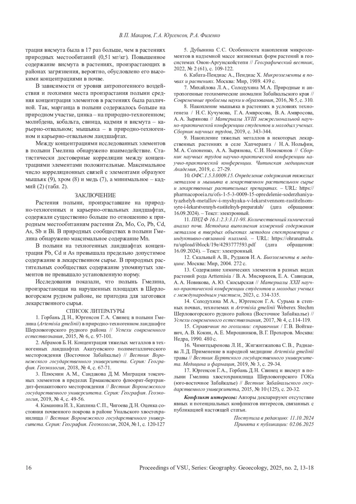 1. Горбань Д. Н., Юргенсон Г. А. Свинец в полыни Гмелина (Artemisia gmelinii) в природно-техногенном ландшафте Шерловогорского рудного района // Успехи современного естествознания, 2015, № 6, с. 97-101.