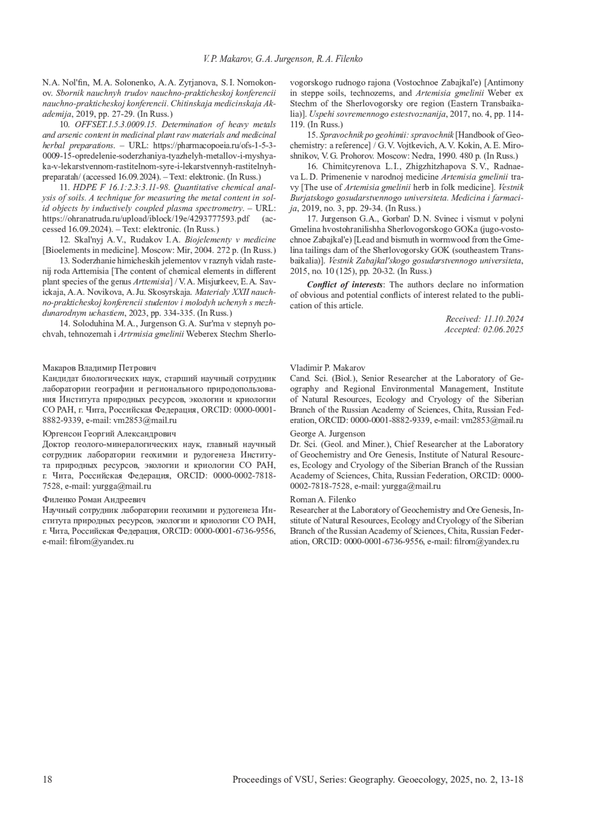 14. Солодухина М.А., Юргенсон Г. А. Сурьма в степных почвах, техноземах и Artrmisia gmelinii Weberex Stechm Шерловогорского рудного района (Восточное Забайкалье) // Успехи современного естествознания, 2017, № 4, с.114-119.