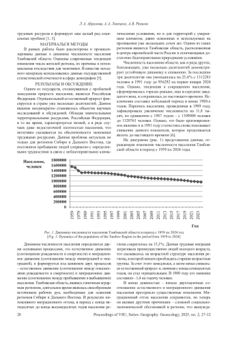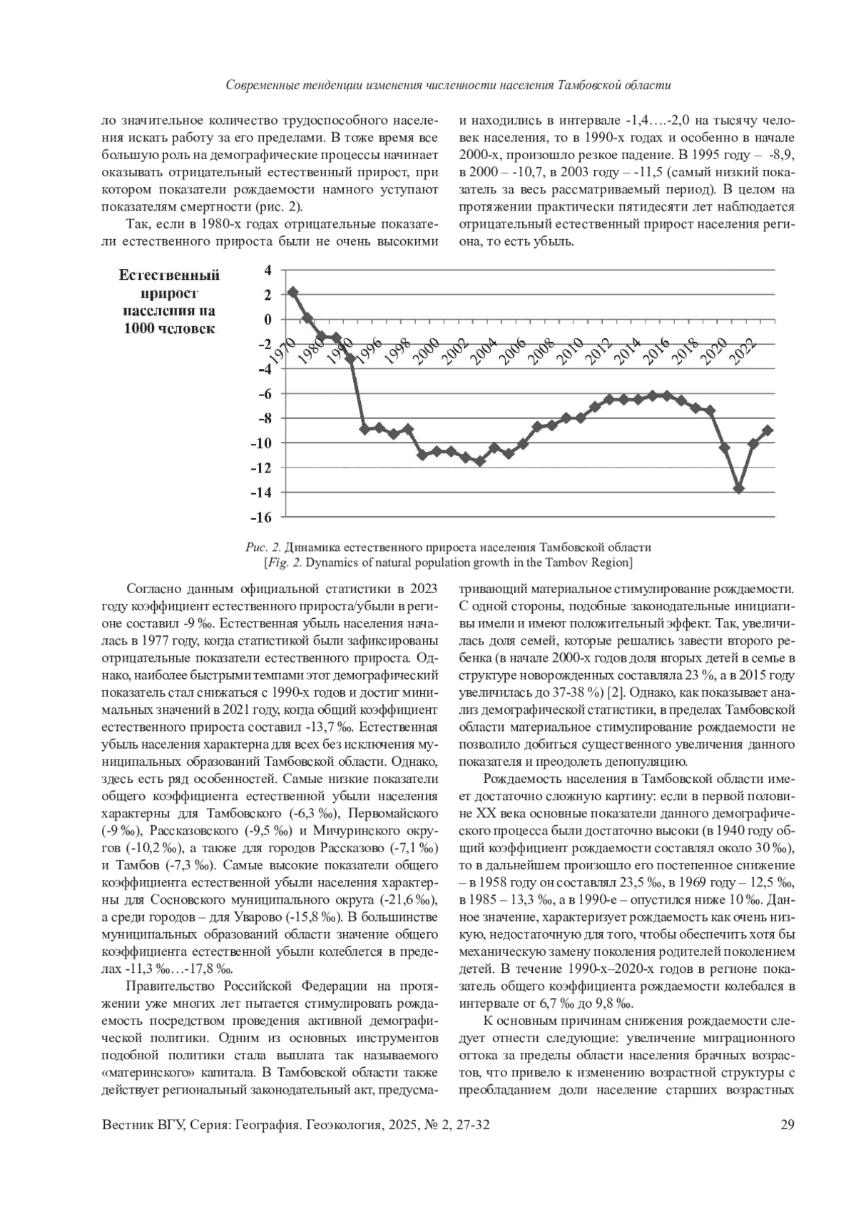 И методы. В качестве исходного материала использовались данные государственной статистической отчетности, на основании которых рассчитывались показатели естественного прироста и естественной убыли населения, коэффициенты рождаемости и смертности. Результаты и обсуждение. В последние десятилетия в большинстве регионов Российской Федерации отмечаются тенденции к сокращению численности населения. Частично это происходит из-за долговременных тенденций, сформировавшихся после второй мировой войны, частично - вследствие социально-экономических особенностей последних десятилетий. Численность населения области, начиная с середины прошлого века, демонстрирует устойчивую тенденцию к снижению. За последние три десятилетия она снизилась на 25,4 % с 1312283 человек в 1991 году до 956292 на первое января 2024 года. Естественная убыль характерна для всех муниципальных образований региона. В большинстве муниципальных образований значение общего коэффициента естественной убыли колеблются в пределах -11,3 %о…-17,8 %о. Выводы. Основная причина этого заключается в существенном превышении показателей смертности над рождаемостью, а также значительном миграционном оттоке. Несмотря на все принимаемые меры, кардинальным образом изменить ситуацию пока не удается, что связано, во-первых, с недостаточно высокой эффективностью проводимых мероприятий, а, во-вторых, с характерной для демографических процессов инерционностью.