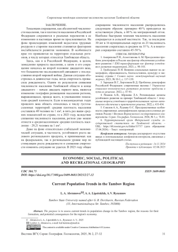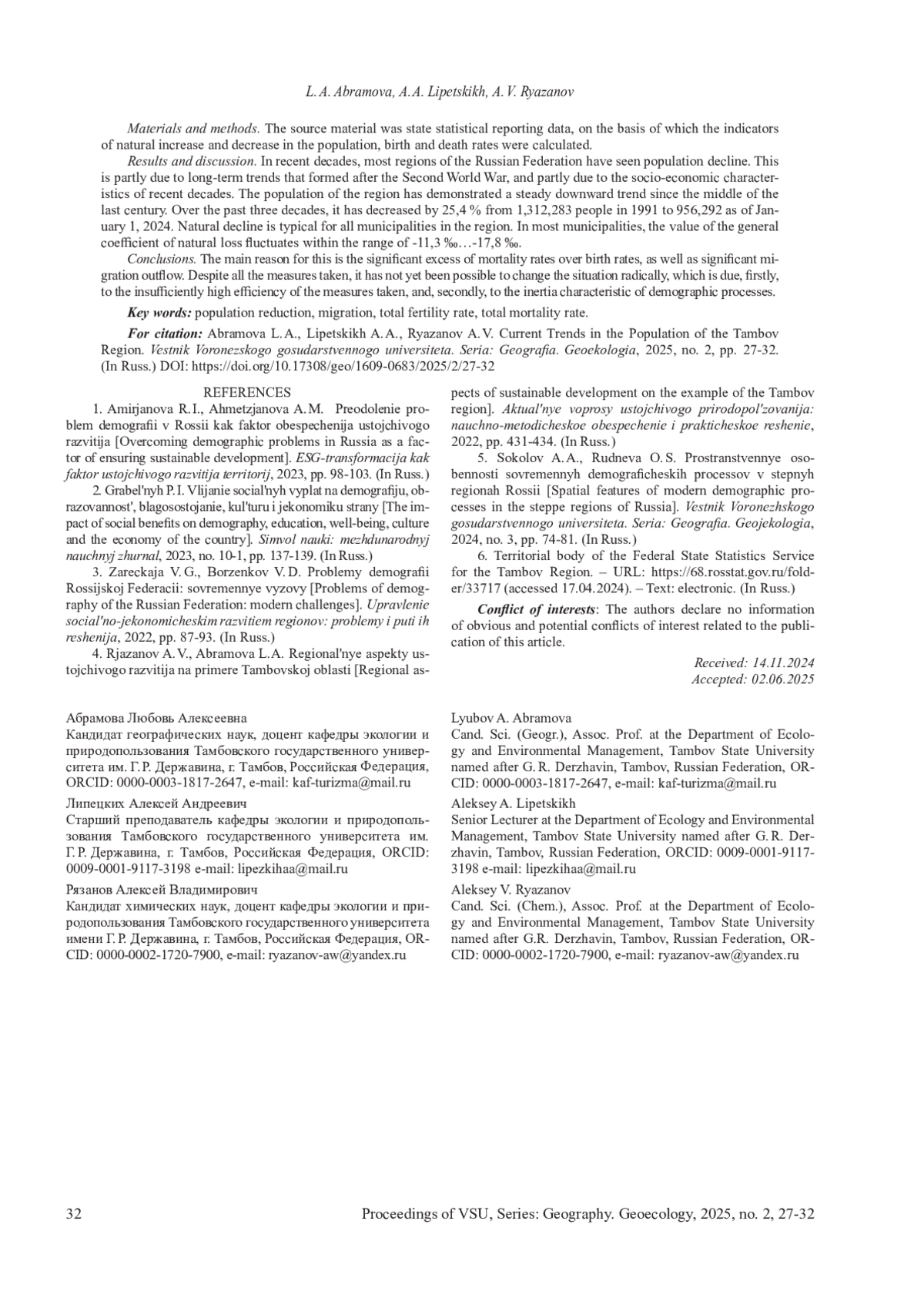 4. Рязанов А. В., Абрамова Л.А. Региональные аспекты устойчивого развития на примере Тамбовской области // Актуальные вопросы устойчивого природопользования: научно-методическое обеспечение и практическое решение, 2022, с. 431-434. EDN: LPQCDT