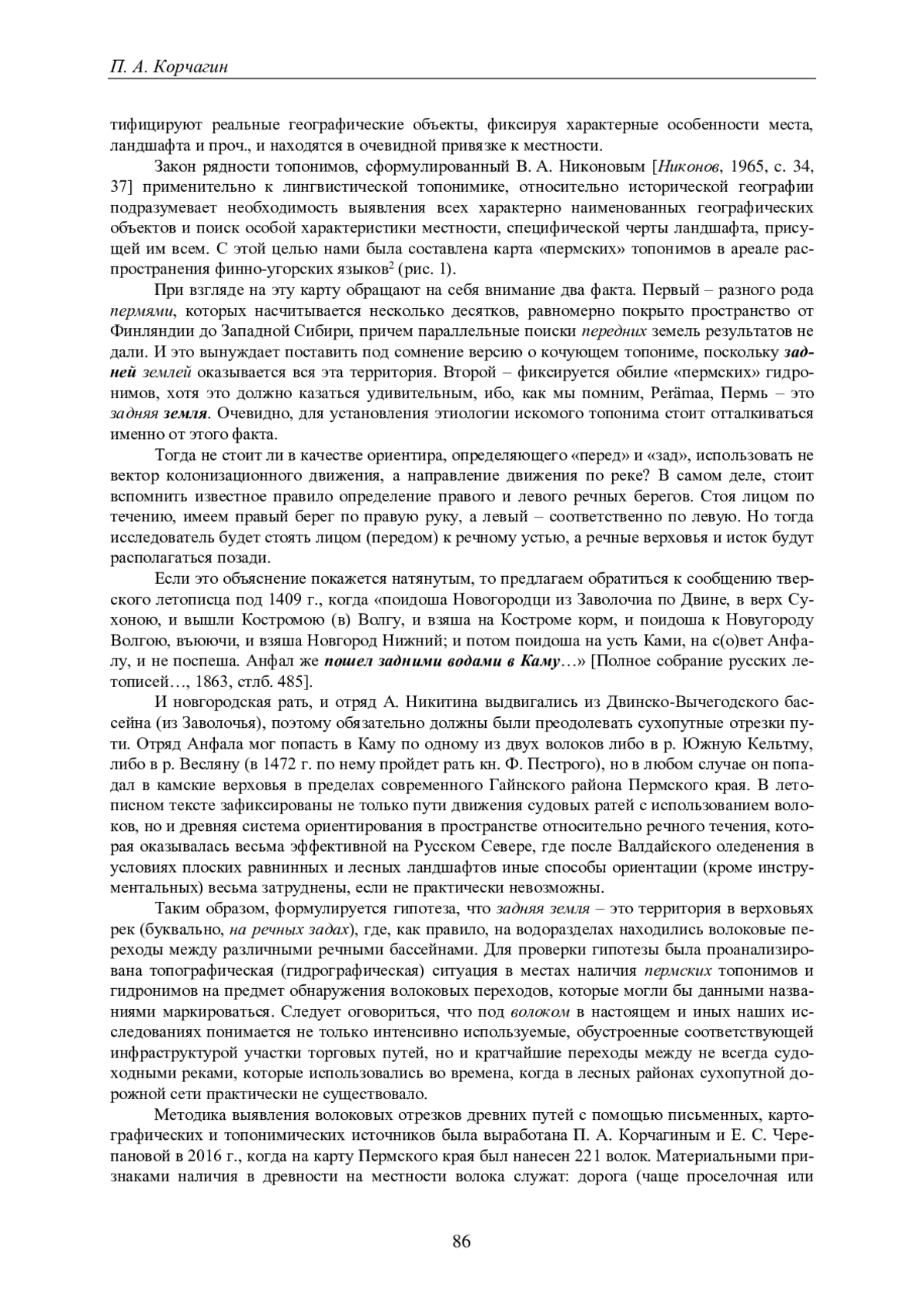 Исследование является продолжением статьи, представляющей собой историографический обзор дискуссии об этимологии топонима Пермь. К историко-географическому исследованию было привлечено около сорока географических объектов с пермскими названиями, обнаруженных на территории Финляндии и 13 регионов Российской Федерации. Разного рода «задние земли» (перми) равномерно распределены на всей изученной территории, причем параллельные поиски «передних земель» результатов не дали, что вынуждает поставить под сомнение версию о дрейфующем топониме. При этом фиксируется обилие пермских гидронимов, хотя это должно казаться парадоксальным, ибо Perämaa, Пермь - это земля задняя. Применение историко-географических методов позволило выяснить этиологию (происхождение) онимов пермского ряда, которые следует понимать не просто как заднюю землю, но землю на речных задах, в верховьях рек, в районах сосредоточения сухопутных отрезков водно-волоковых путей. В окрестностях 30 «пермей» фиксируются волоки разной интенсивности использования, в 19 случаях волоков обнаружить не удалось. Исключения из правила фиксируются на юго-восточной периферии изучаемой области, у сел и деревень с названием Пермяки и Перминовы, которые номинированы по происхождению или по фамилии первопоселенцев. В древности важнейшие транзитно-транспортные развязки тщательно фиксировались на местности пермскими топонимами и гидронимами, именно поэтому районы концентрации важнейших волоков (Перми и Пермцы) привлекали особое внимание новгородских, а позднее московских властей, как узлы прочности на колонизируемой территории.