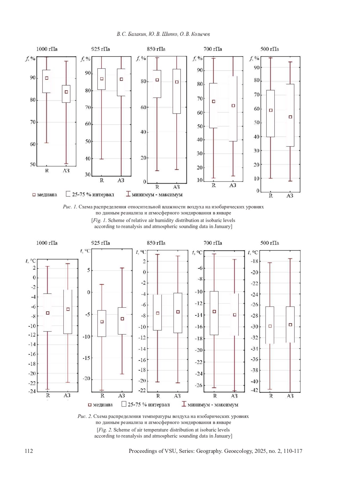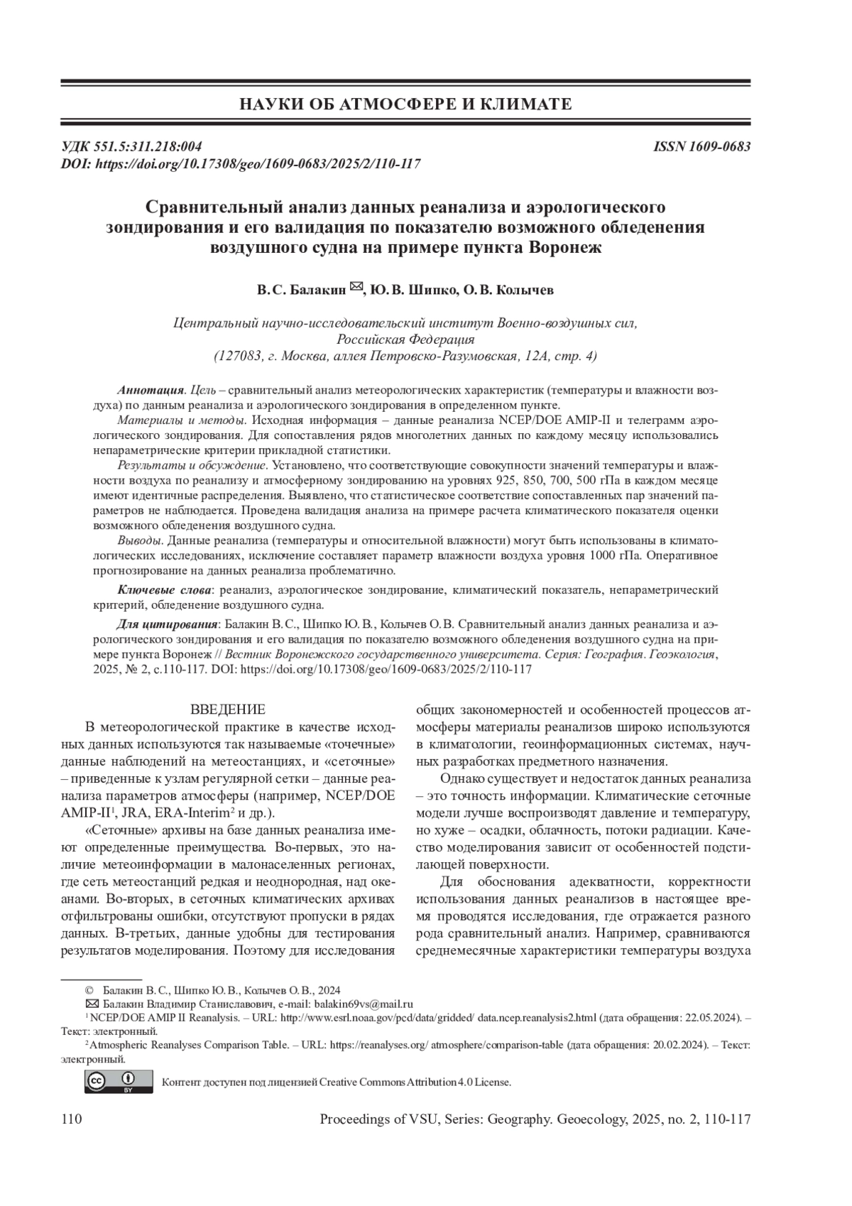 Цель - сравнительный анализ метеорологических характеристик (температуры и влажности воздуха) по данным реанализа и аэрологического зондирования в определенном пункте. Материалы и методы. Исходная информация - данные реанализа NCEP/DOE AMIP-II и телеграмм аэрологического зондирования. Для сопоставления рядов многолетних данных по каждому месяцу использовались непараметрические критерии прикладной статистики. Результаты и обсуждение. Установлено, что соответствующие совокупности значений температуры и влажности воздуха по реанализу и атмосферному зондированию на уровнях 925, 850, 700, 500 гПа в каждом месяце имеют идентичные распределения. Выявлено, что статистическое соответствие сопоставленных пар значений параметров не наблюдается. Проведена валидация анализа на примере расчета климатического показателя оценки возможного обледенения воздушного судна. Выводы. Данные реанализа (температуры и относительной влажности) могут быть использованы в климатологических исследованиях, исключение составляет параметр влажности воздуха уровня 1000 гПа. Оперативное прогнозирование на данных реанализа проблематично.
