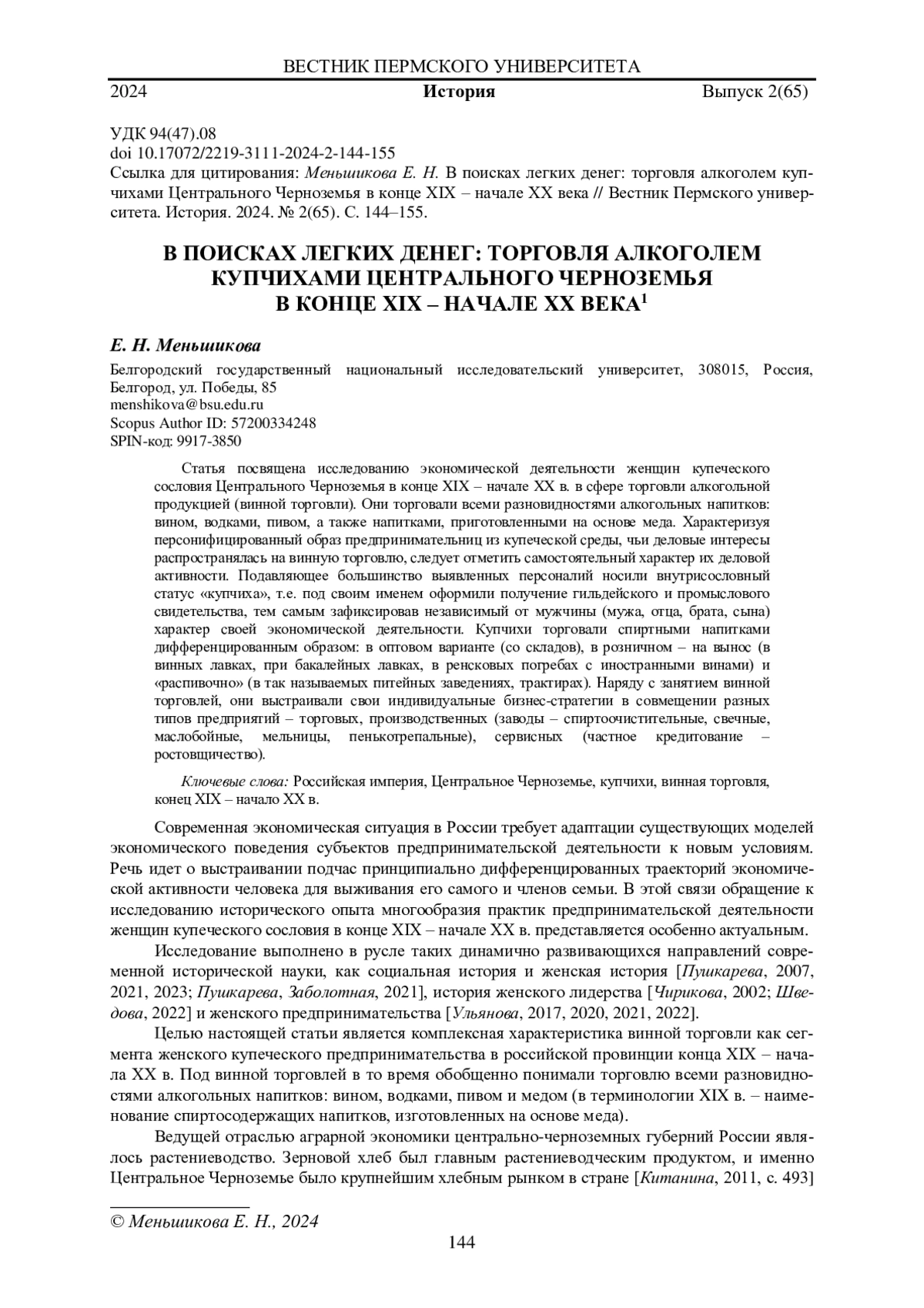 Современная экономическая ситуация в России требует адаптации существующих моделей экономического поведения субъектов предпринимательской деятельности к новым условиям. Речь идет о выстраивании подчас принципиально дифференцированных траекторий экономической активности человека для выживания его самого и членов семьи. В этой связи обращение к исследованию исторического опыта многообразия практик предпринимательской деятельности женщин купеческого сословия в конце XIX – начале XX в. представляется особенно актуальным.
