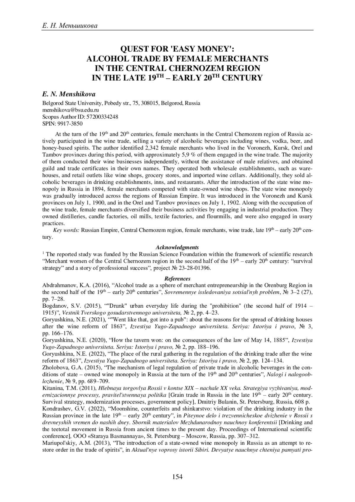 26. Шевченко И.А. Незаконная торговля спиртным в великорусской деревне конца XIX - начала XX в. // Вестник Тамбов. ун-та. Гуманитарные науки. 2014. № 3 (131). С. 151-157. EDN: SDHTSJ