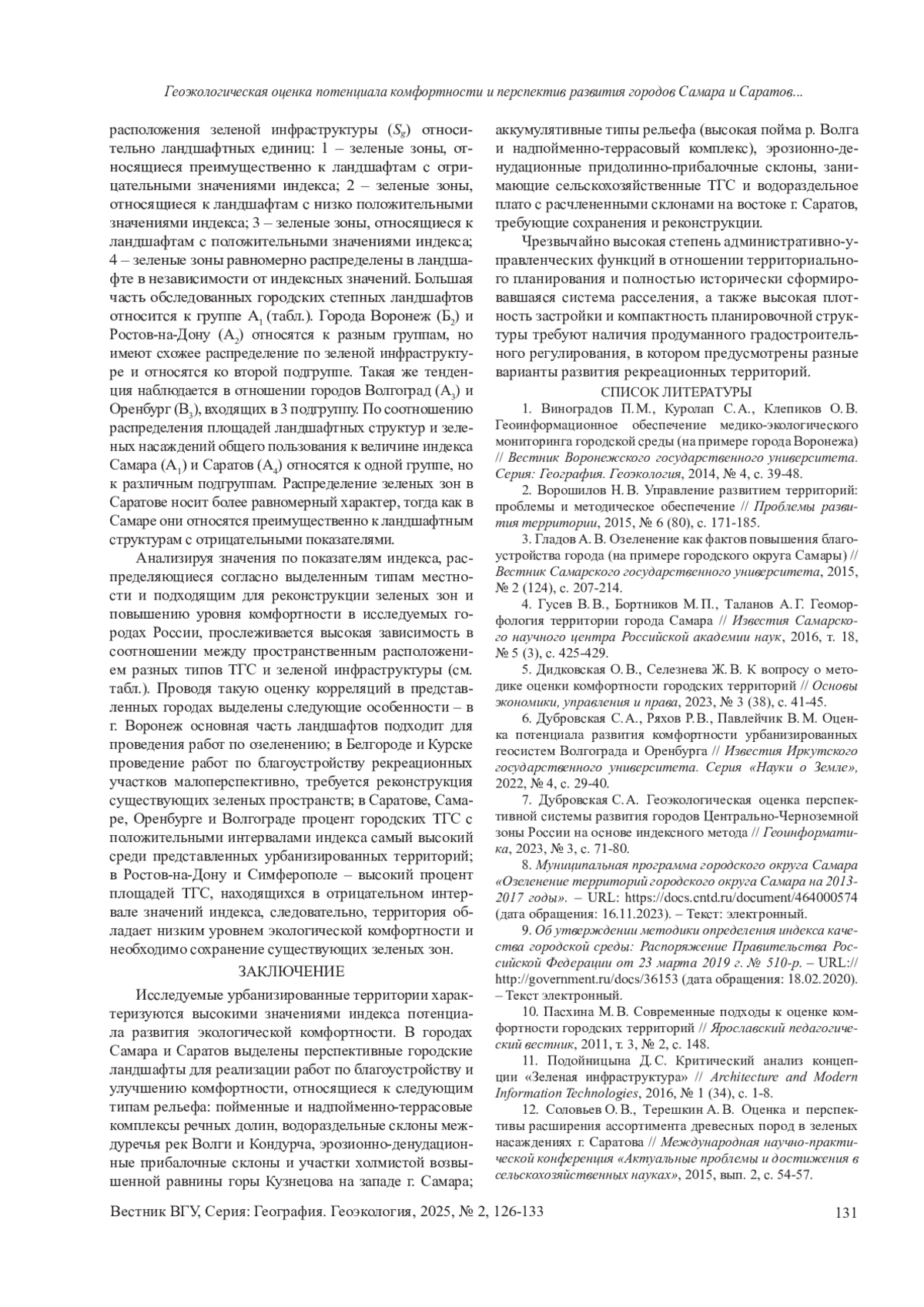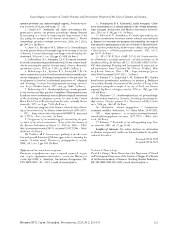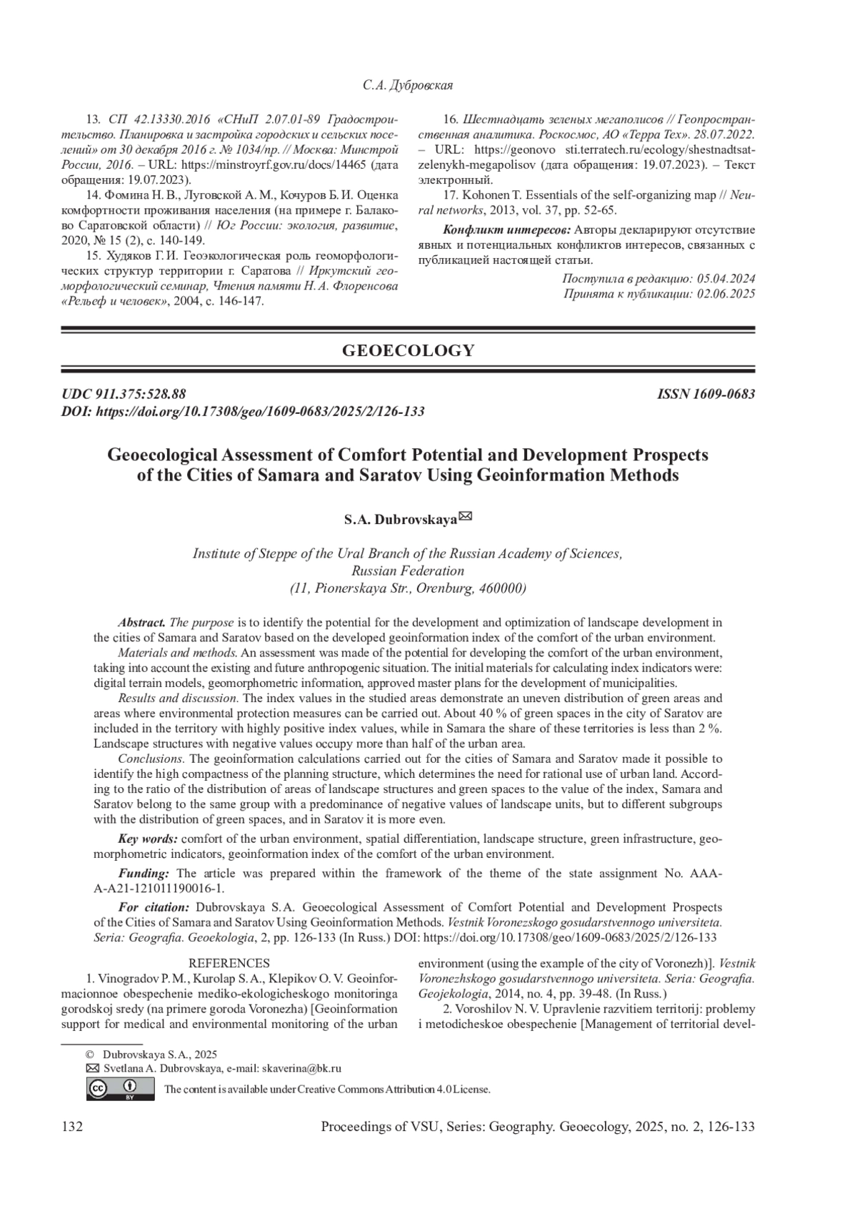 6. 	Дубровская С. А., Ряхов Р В., Павлейчик В. М. Оценка потенциала развития комфортности урбанизированных геосистем Волгограда и Оренбурга // Известия Иркутского государственного университета. Серия “Науки о Земле”, 2022, № 4, с. 29-40. EDN: IWTEUS