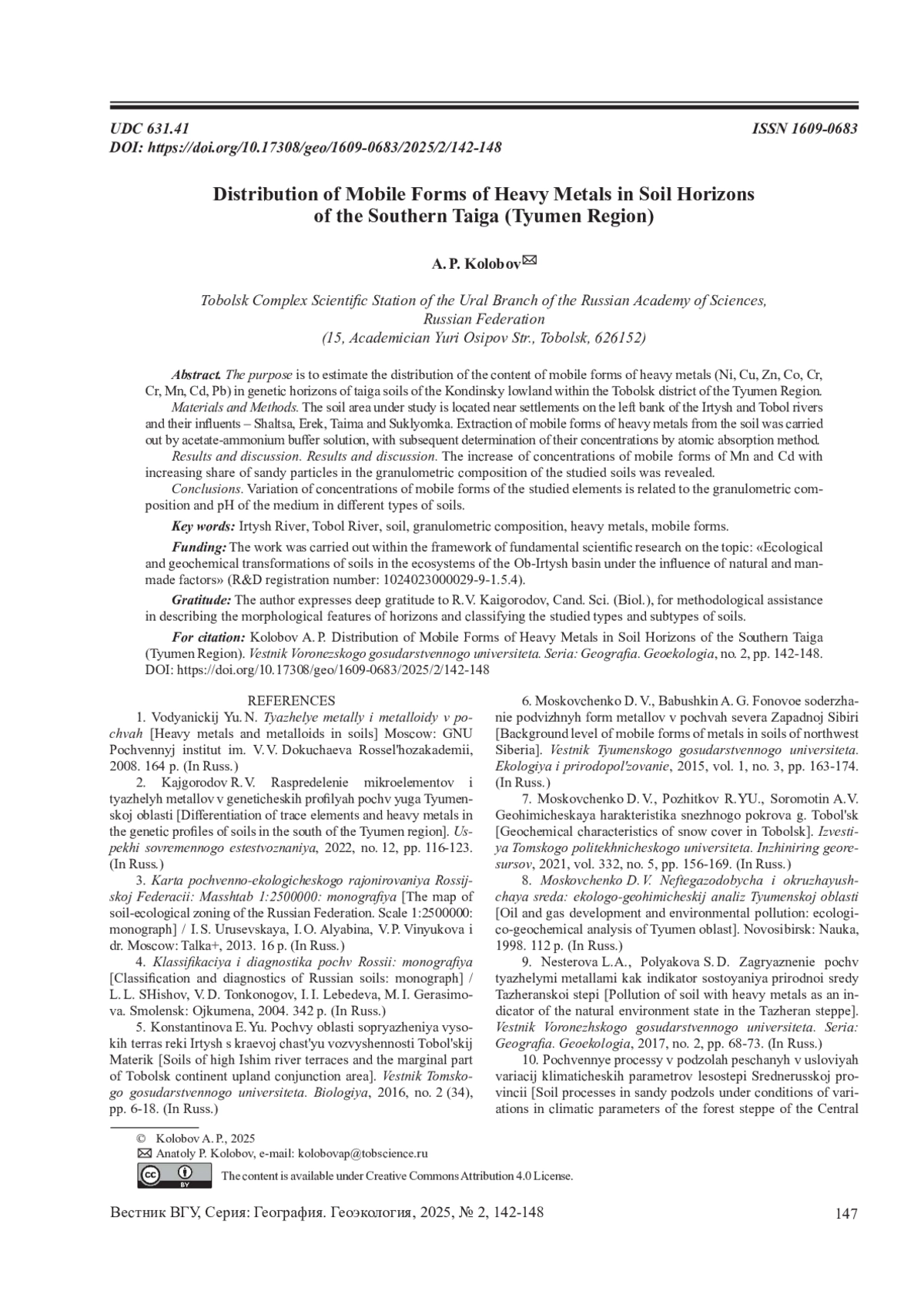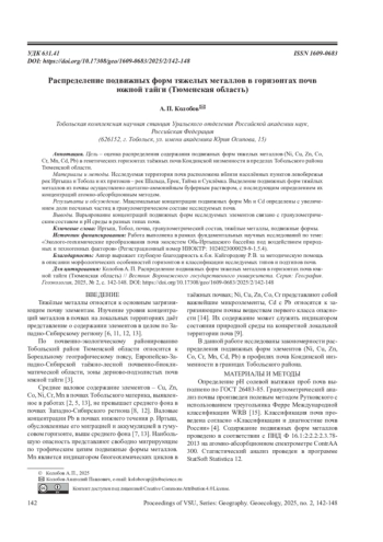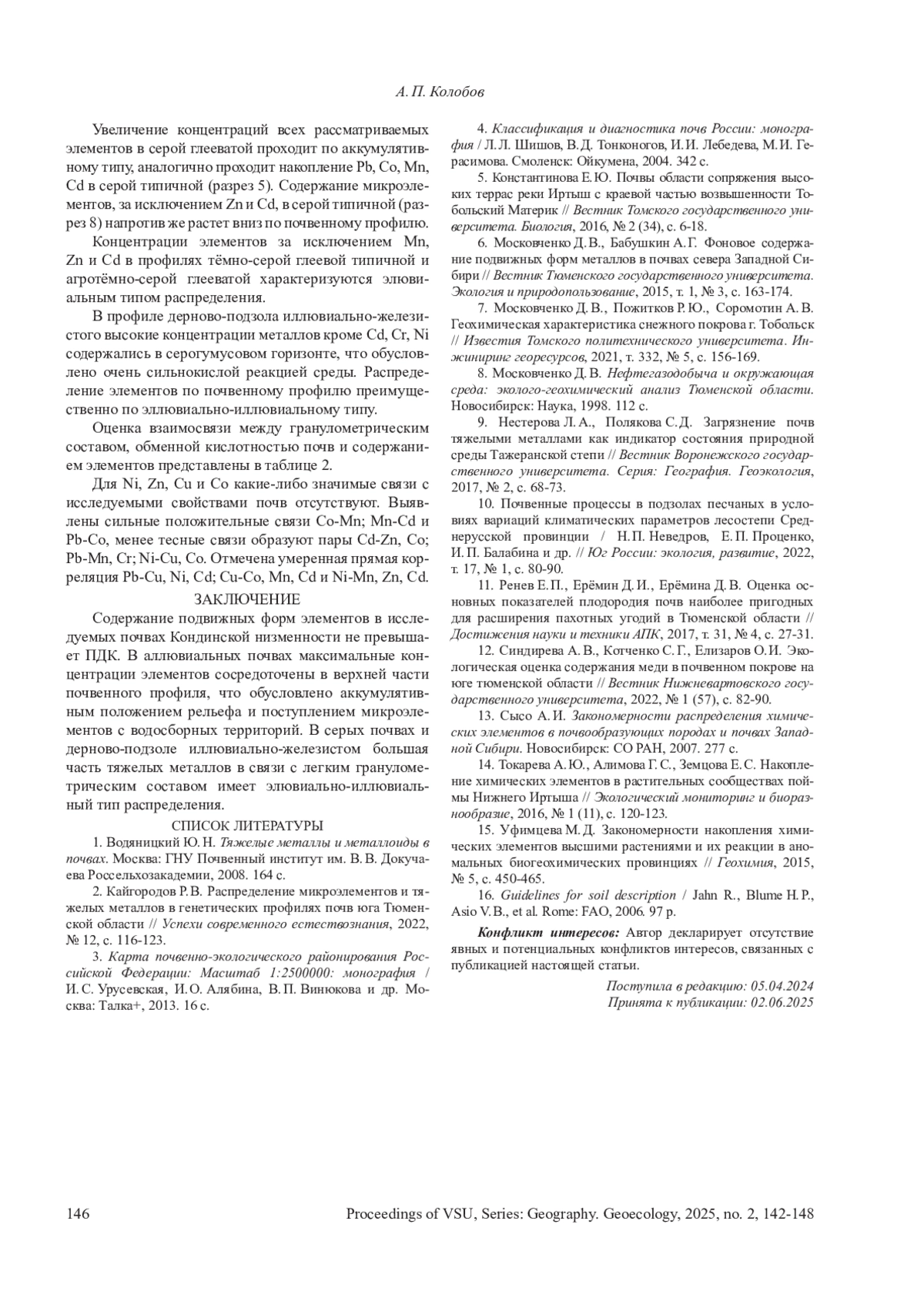2. 	Кайгородов Р. В. Распределение микроэлементов и тяжелых металлов в генетических профилях почв юга Тюменской области // Успехи современного естествознания, 2022, № 12, с. 116-123.