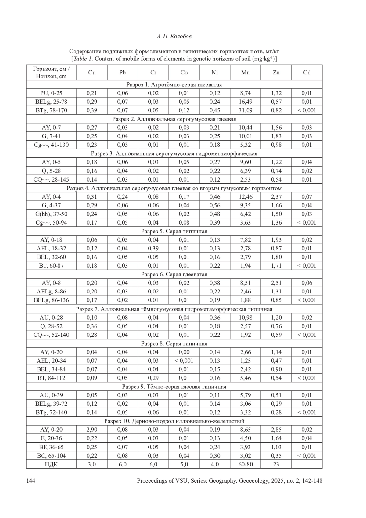 В верхнем горизонте дерново-подзола иллювиально-железистого также определена очень сильнокислая среда почвы, обусловленная хвоей в лесной подстилке [9]. По почвенным горизонтам кислотность сохраняется достаточно высокой (3,9-4,6 ед. рН), поэтому наблюдается равномерное распределение Pb и Cr по профилю почвы. Здесь также выявлена максимальная концентрация Cu (2,9 мг/кг), вследствие умеренной положительной связи Cu с Mn она закрепляется в почве с оксидами Mn в первую очередь и проявляет себя как манганофил (см. табл. 2) [1]. Распределение остальных элементов по почвенному профилю происходит преимущественно по эллювиально-иллювиальному типу. Распределение тяжелых металлов в горизонтах темно-серой глеевой типичной почвы имеет схожесть с агротёмно-серой глееватой почвой: из-за утяжеления гранулометрического состава к нижним горизонтам в них определены максимальные концентрации исследуемых элементов.