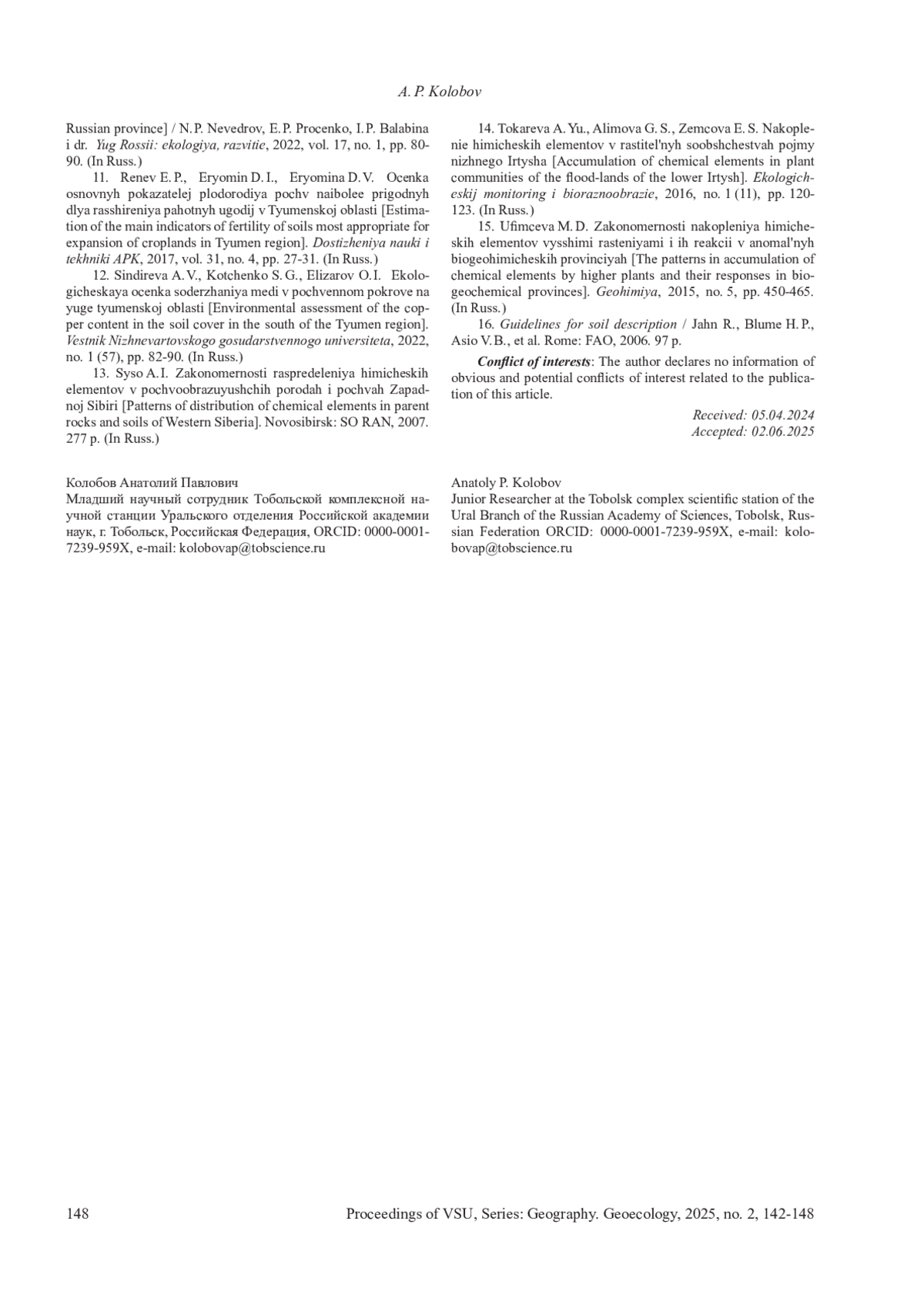 12. 	Синдирева А. В., Котченко С. Г., Елизаров О. И. Экологическая оценка содержания меди в почвенном покрове на юге тюменской области // Вестник Нижневартовского государственного университета, 2022, № 1 (57), с. 82-90.