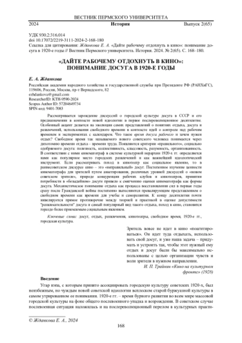 Рассматривается зарождение дискуссий о городской культуре досуга в СССР и его предназначении в контексте новой идеологии в первое послереволюционное десятилетие. Особенный акцент делается на эволюции самих представлений о понятиях отдыха, досуга и развлечений, использования свободного времени в контексте идей о контроле над рабочим временем и экспериментах с календарем. Что такое время досуга рабочего и зачем нужен отдых? Свободное время так называемого нового советского человека понимается через дихотомию времени отдыха - времени труда. Появляются критерии «правильного», социально одобряемого досуга: полезность, коллективность, классовость, разумность, организованность. В соответствии с ними кинематограф в системе культурной иерархии 1920-х гг. определяется нами как популярное место городских развлечений и как важнейший идеологический инструмент. Если рассматривать поход в кинотеатр как социальное явление, то в раннесоветском дискурсе кино - это «неправильный» досуг. Постепенное изучение ценности кинематографа для зрителей путем анкетирования, различных уровней дискуссий о «новом советском зрителе», природе конкуренции рабочих клубов и кинотеатров, принятии потребности в «безыдейном» досуге привело к смягчению оценки кинематографа как формы досуга. Механистическое понимание отдыха как процесса восстановления сил в первые годы сразу после Гражданской войны постепенно вытесняются превалирующим представлением о свободном времени как времени для учебы и саморазвития. К концу десятилетия почти нивелируется прямое противоречие между теорией и практикой в оценке допустимости “развлекательности” досуга и самый популярный вид такого отдыха, поход в кино, становится гораздо более приемлемым социальным явлением.
