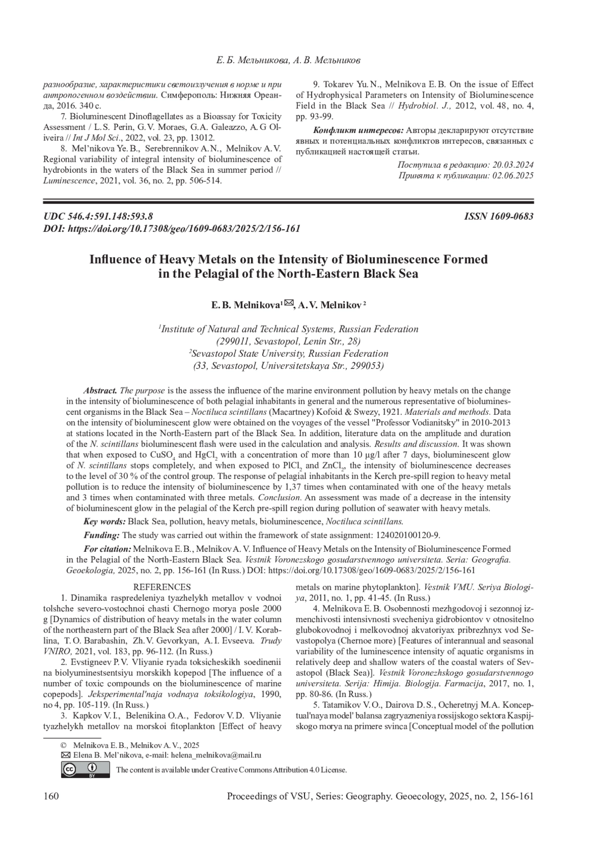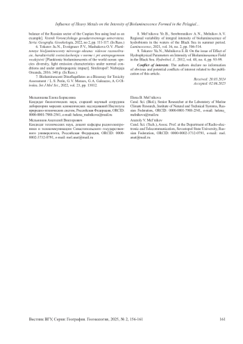 8. Mel’nikova Ye. B., Serebrennikov A. N., Melnikov A. V Regional variability of integral intensity of bioluminescence of hydrobionts in the waters of the Black Sea in summer period // Luminescence, 2021, vol. 36, no. 2, pp. 506-514. EDN: QEBBBZ