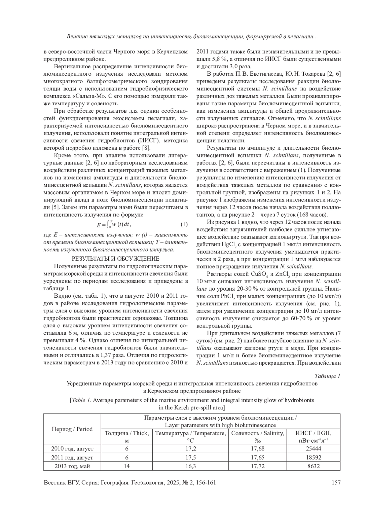 В исследованиях [1] отмечено, что в период август-сентябрь 2010 года в Керченском предпроливном районе не было зафиксировано превышения ПДК тяжелых металлов (см. табл. 2). Сравнение с нашими результатами по интегральной интенсивности свечения гидробионтов (см. табл. 1) показывает, что в этот период в Керченском предпроливном районе наблюдалось наибольшее значение ИИСГ (25444 пВт·см–2л –1). В августе-сентябре 2011 года в Керченском предпроливном районе наблюдалось превышение ПДК меди [1], при этом содержание меди в толще воды составляло 1,0-90 мкг/л. По нашим исследованиям в этот период среднее значение ИИСГ составляло 18592 пВт·см–2л –1, что было в 1,37 раза меньше, чем в этом районе в 2010 года при практически таких же гидрологических параметрах и отсутствии превышения ПДК загрязняющими веществами.