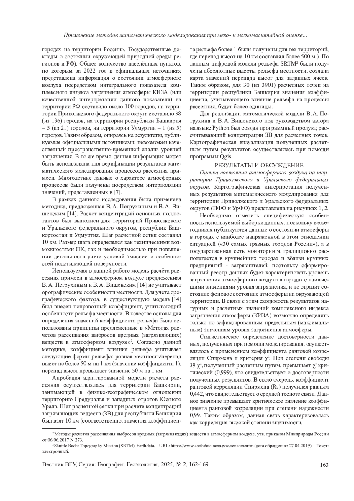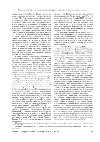 Цель - мезо- и мелкомасштабная характеристика загрязнения атмосферы с применением инструментов математического моделирования. Материалы и методы. Для характеристики уровня загрязнения атмосферного воздуха для больших по площади территорий был применен метод математического моделирования. Расчёт концентраций поллютантов в атмосфере осуществлялся для территорий Приволжского и Уральского ФО, республик Удмуртия и Башкирия. Для учета влияния орографического фактора было предложено введение поправочного коэффициента. Результаты и обсуждение. В ходе проведенного исследования выделены ареалы повышенного загрязнения. Применение адаптированной методики (учитывающей орографический фактор) показало необходимость апробации ее для территории с более расчлененным рельефом (регионы Восточной Сибири). Выводы. Результаты статистической верификации показали допустимость применения методов математического моделирования при оценке состояния атмосферного воздуха территорий, характеризующихся значительными размерами.
