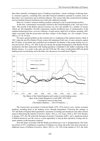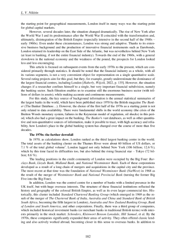 Статья посвящена развитию Лондона в качестве мирового и национального банковского центра на протяжении последних 50 лет - от начала 1970-х гг. до настоящего времени. В основу исследования положены большие массивы исторической статистики, систематизированные и обработанные автором. Лондон, являвшийся крупнейшим банковским центром мира в XIX - начале XX вв., в дальнейшем постепенно сдавал свои позиции; к 1970 г. он занимал только третье место в глобальной иерархии. Новые факторы, проявившиеся в 1970-е гг. (например, кризис Бреттон-Вудской валютной системы) способствовали дальнейшему отступлению Лондона. На следующем историческом этапе ситуация резко изменилась в результате дерегулирования национальной финансовой системы, проведенного консервативными правительствами М. Тэтчер и Дж. Мейджора (1979-1997), а также «новыми лейбористами» Т. Блэра (1997-2007). Пользуясь новым уровнем предпринимательской свободы, британские банки существенно расширили масштабы и направления своей деятельности. В 2008 г. Лондон занимал второе место в мире по активам банковских корпораций. Однако это достижение в значительной мере было связано с перепроизводством рискованных финансовых инструментов. Банковская система Великобритании пережила тяжелый спад во время Великой рецессии 2008-2009 гг. Вместе с тем основные проблемы были тогда сконцентрированы не в Лондоне, где банки оставались относительно стабильными, а в Эдинбурге. В дальнейшем лондонские корпорации возглавили процесс оздоровления национальной банковской системы. Лондон, давно утративший абсолютное лидерство, все же остается очень важным финансовым узлом и уверенно входит в число пяти - шести крупнейших банковских центров мира.