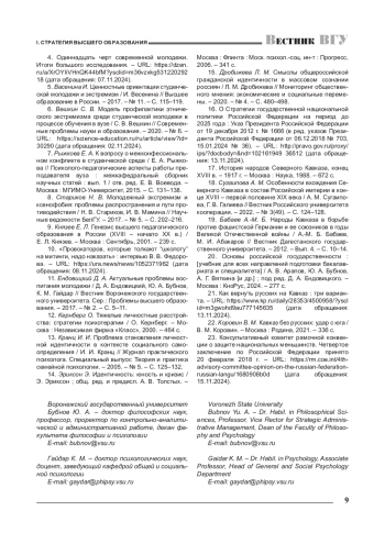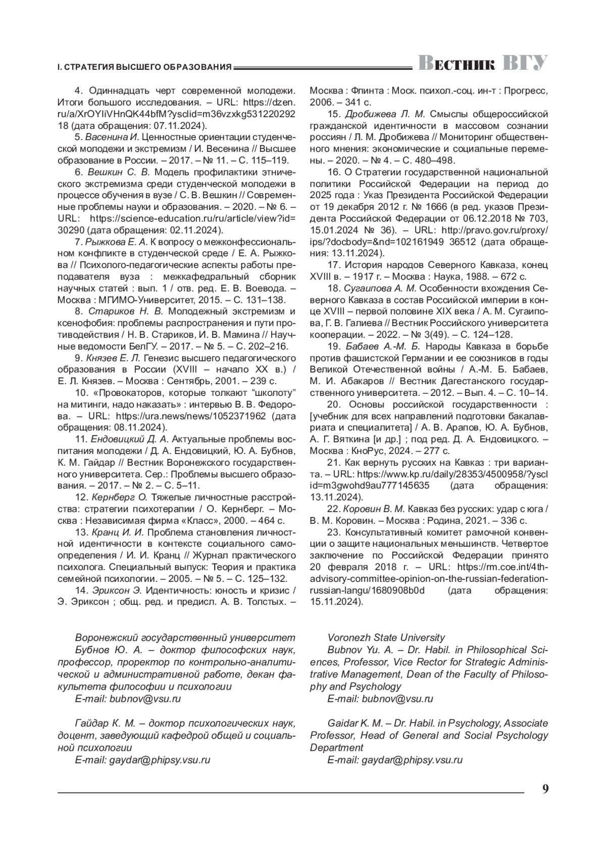 11. 	Ендовицкий Д. А. Актуальные проблемы воспитания молодежи / Д. А. Ендовицкий, Ю. А. Бубнов, К. М. Гайдар // Вестник Воронежского государственного университета. Сер.: Проблемы высшего образования. - 2017. -№ 2. - С. 5-11.