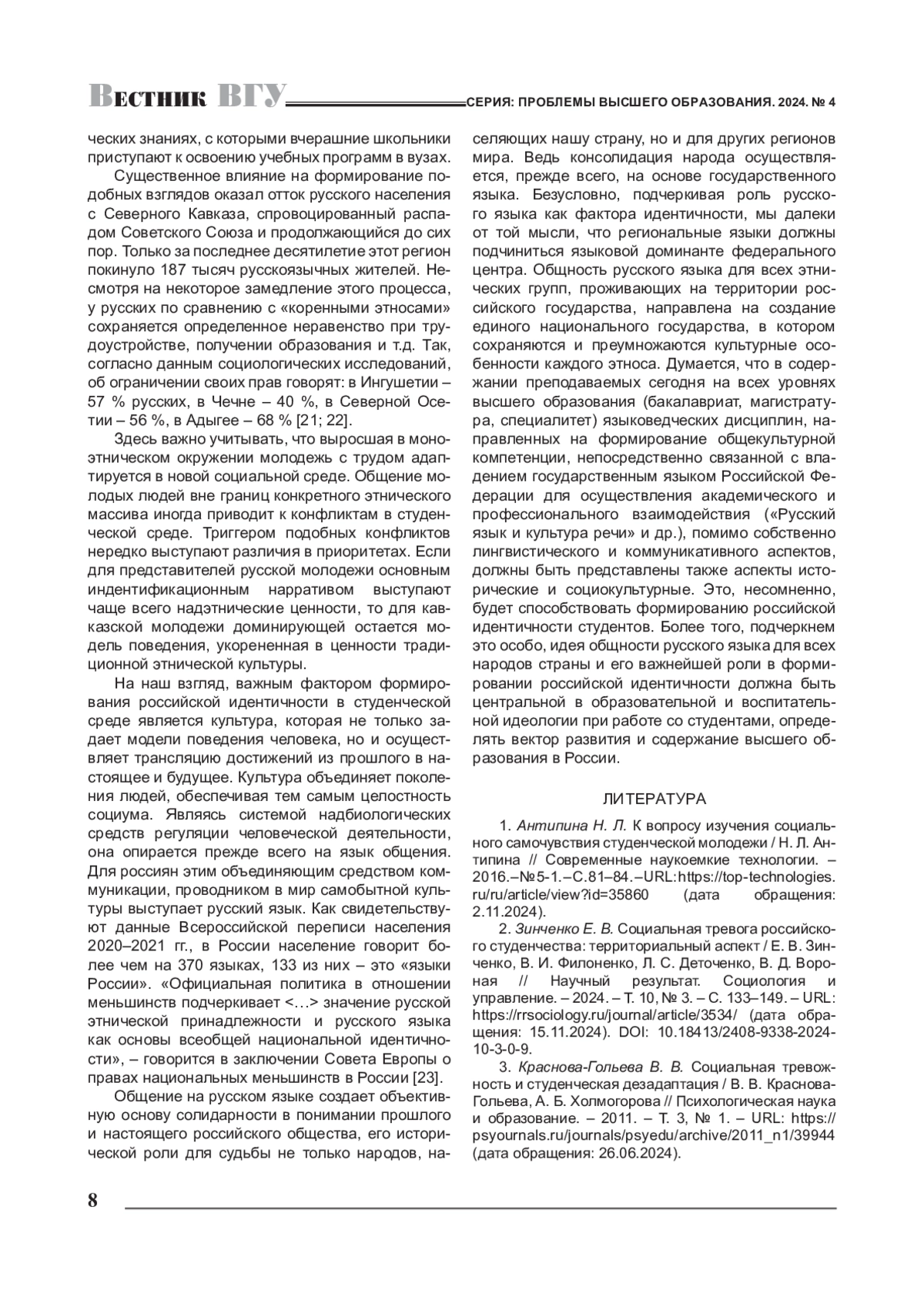 2. 	Зинченко Е. В. Социальная тревога российского студенчества: территориальный аспект / Е. В. Зинченко, В. И. Филоненко, Л. С. Деточенко, В. Д. Вороная // Научный результат. Социология и управление.-2024.-Т. 10, №3.-С. 133-149.-URL: https://rrsociology.ru/journal/article/3534/(дата обращения: 15.11.2024). DOI: 10.18413/2408-9338-202410-3-0-9 EDN: BUPUIE