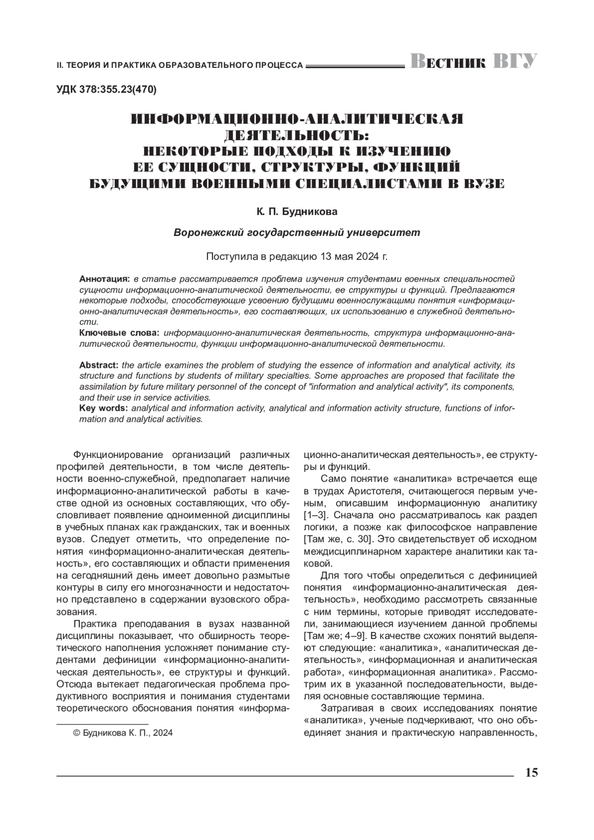 В статье рассматривается проблема изучения студентами военных специальностей сущности информационно-аналитической деятельности, ее структуры и функций. Предлагаются некоторые подходы, способствующие усвоению будущими военнослужащими понятия «информационно-аналитическая деятельность», его составляющих, их использованию в служебной деятельности.