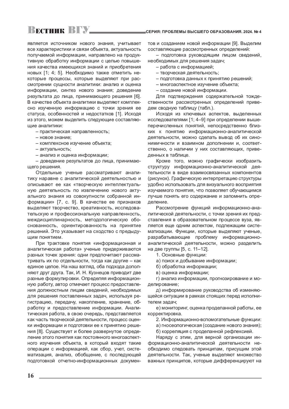 При трактовке понятия «информационная и аналитическая работа» ученые придерживаются разных точек зрения: одни предпочитают рассматривать их по отдельности, тогда как другие – как единое целое. На наш взгляд, оба подхода дополняют друг друга. Так, И. Н. Кузнецов приводит две разные формулировки. Определяя информационную работу, автор отмечает процесс предоставления должностным лицам сведений, необходимых для решения поставленных задач, используя регистрацию, передачу, накопление, хранение, обработку и предоставление информации. Аналитическая работа, в свою очередь, представляется как часть творческой деятельности, процесс оценки информации и подготовки ее к принятию решения [8].