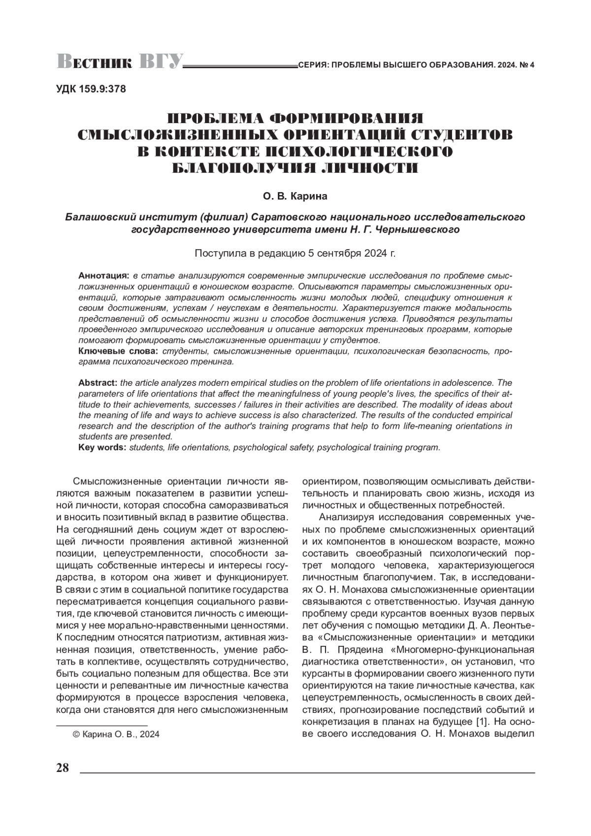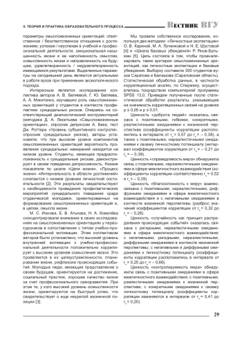 В статье анализируются современные эмпирические исследования по проблеме смысложизненных ориентаций в юношеском возрасте. Описываются параметры смысложизненных ориентаций, которые затрагивают осмысленность жизни молодых людей, специфику отношения к своим достижениям, успехам / неуспехам в деятельности. Характеризуется также модальность представлений об осмысленности жизни и способов достижения успеха. Приводятся результаты проведенного эмпирического исследования и описание авторских тренинговых программ, которые помогают формировать смысложизненные ориентации у студентов.