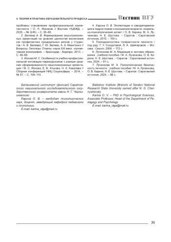 4. 	Карина О. В. Экспектации и самодетерминация в подростковом и юношеском возрасте: социально-психологический аспект / О. В. Карина, М. А. Лученкова, Н. Е. Шустова. - Саратов: Саратовский источник, 2010. - 100 с.