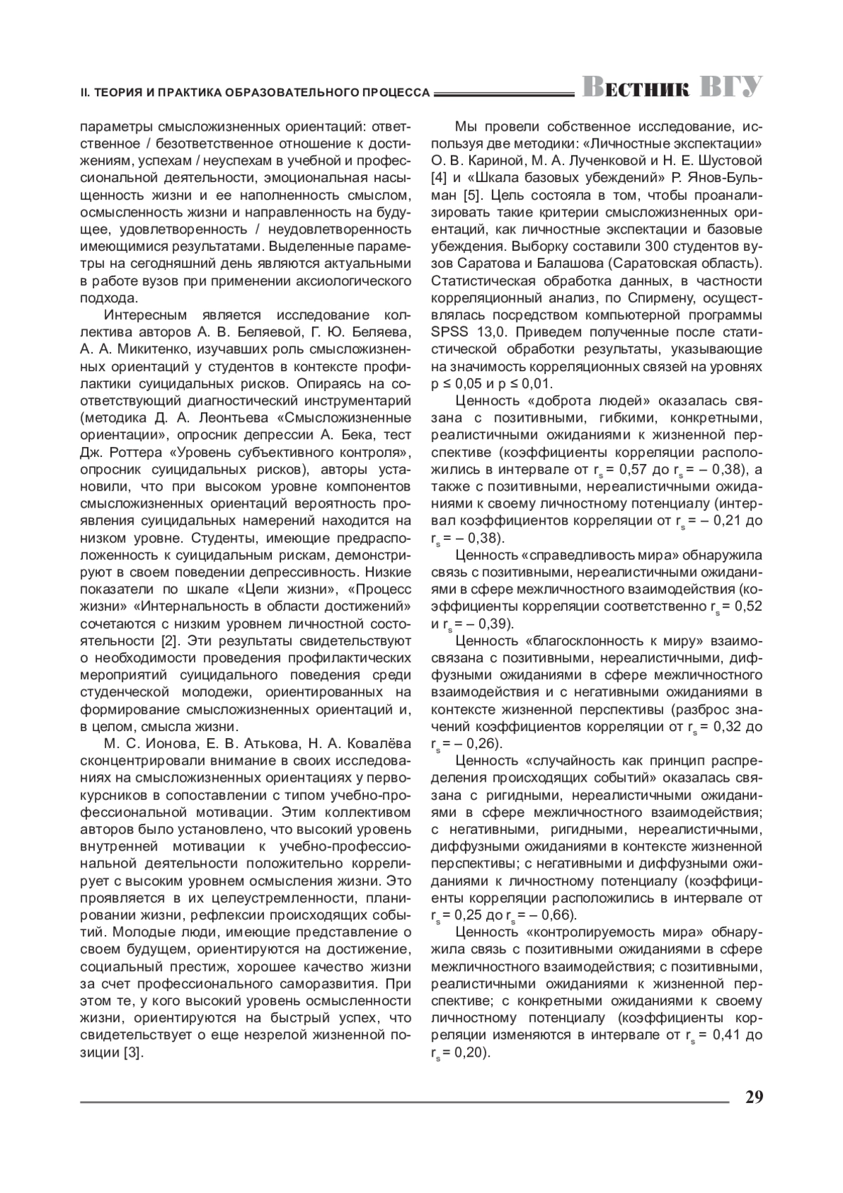 Интересным является исследование коллектива авторов А. В. Беляевой, Г. Ю. Беляева, А. А. Микитенко, изучавших роль смысложизненных ориентаций у студентов в контексте профилактики суицидальных рисков. Опираясь на соответствующий диагностический инструментарий (методика Д. А. Леонтьева «Смысложизненные ориентации», опросник депрессии А. Бека, тест Дж. Роттера «Уровень субъективного контроля», опросник суицидальных рисков), авторы установили, что при высоком уровне компонентов смысложизненных ориентаций вероятность проявления суицидальных намерений находится на низком уровне. Студенты, имеющие предрасположенность к суицидальным рискам, демонстрируют в своем поведении депрессивность. Низкие показатели по шкале «Цели жизни», «Процесс жизни» «Интернальность в области достижений» сочетаются с низким уровнем личностной состоятельности [2]. Эти результаты свидетельствуют о необходимости проведения профилактических мероприятий суицидального поведения среди студенческой молодежи, ориентированных на формирование смысложизненных ориентаций и, в целом, смысла жизни.
