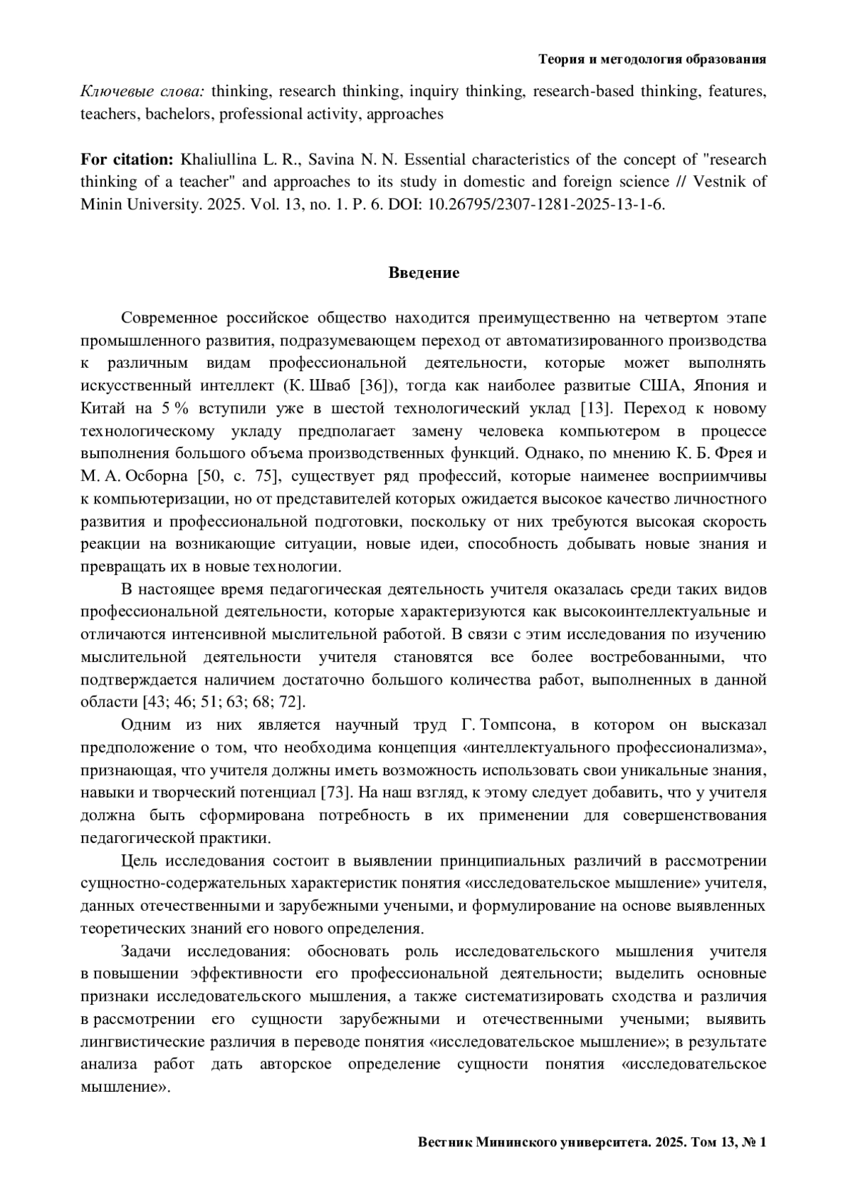 Обсуждение и заключения. Рассмотрены взгляды зарубежных и отечественных (российских) ученых, занимающихся изучением сущности данного понятия, выделены основные признаки исследовательского мышления учителей, специфические различия в подходах ученых к рассмотрению его содержания, дано авторское определение рассматриваемого понятия. Сформулированное авторами определение может оказать влияние на методологию исследований, способствуя уточнению и стандартизации понимания сущности исследовательского мышления в академической и научной среде, а также повлиять на разработку образовательных программ и методик его развития у студентов – будущих учителей.