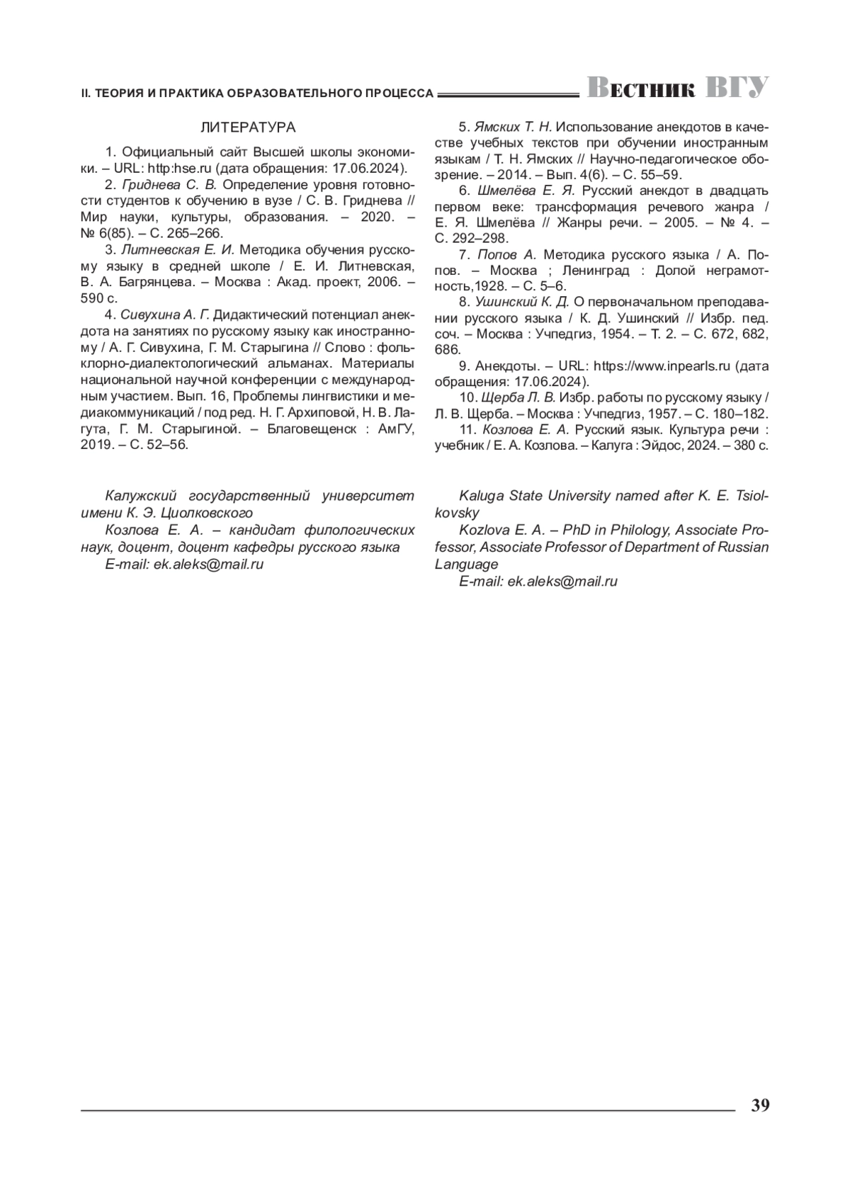 11. Козлова Е. А. Русский язык. Культура речи: учебник/ Е. А. Козлова. - Калуга: Эйдос, 2024. - 380 с.