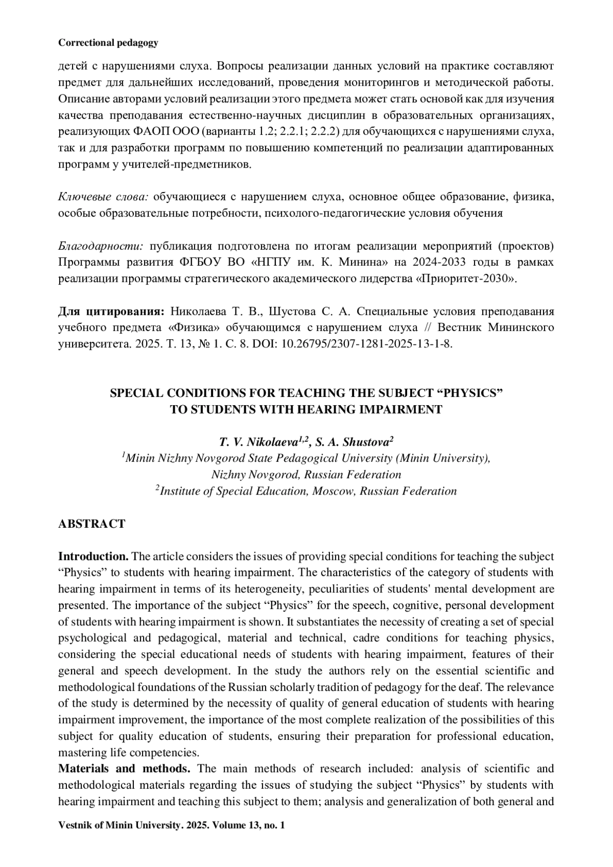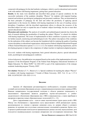 Введение. В статье рассматриваются вопросы обеспечения специальных условий преподавания учебного предмета «Физика» обучающимся с нарушениями слуха. Представлена характеристика категории обучающихся с нарушениями слуха с точки зрения неоднородности ее состава, особенностей психического развития. Показано значение учебного предмета «Физика» для речевого, когнитивного, личностного развития обучающихся с недостатками слуха. Обосновывается необходимость создания комплекса специальных психолого-педагогических, материально-технических и кадровых условий преподавания физики с учетом особых образовательных потребностей обучающихся с нарушениями слуха, особенностей их общего и речевого развития. В исследовании авторы опираются на базовые научно-методические положения отечественной научной школы сурдопедагогики. Актуальность исследования определяется необходимостью повышения качества общего образования обучающихся с нарушениями слуха, важностью наиболее полной реализации возможностей данного предмета для качественного образования обучающихся, обеспечения их готовности к профессиональному образованию, овладения жизненными компетенциями.