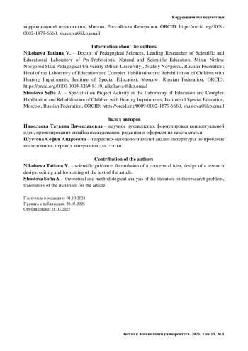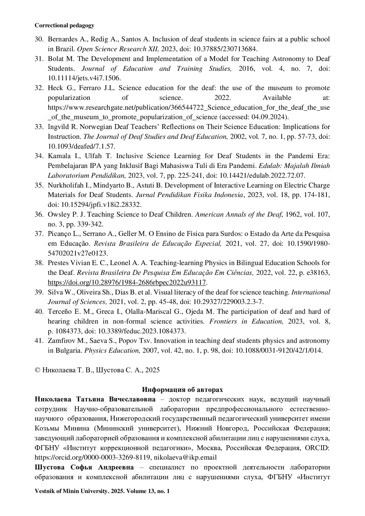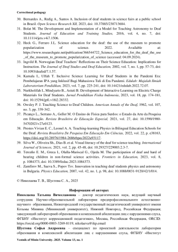 40. Terceño E. M., Greca I., Olalla-Mariscal G., Ojeda M. The participation of deaf and hard of hearing children in non-formal science activities // Frontiers in Education. 2023. Vol. 8. P. 1084373. https://doi.org/10.3389/feduc.2023.1084373.