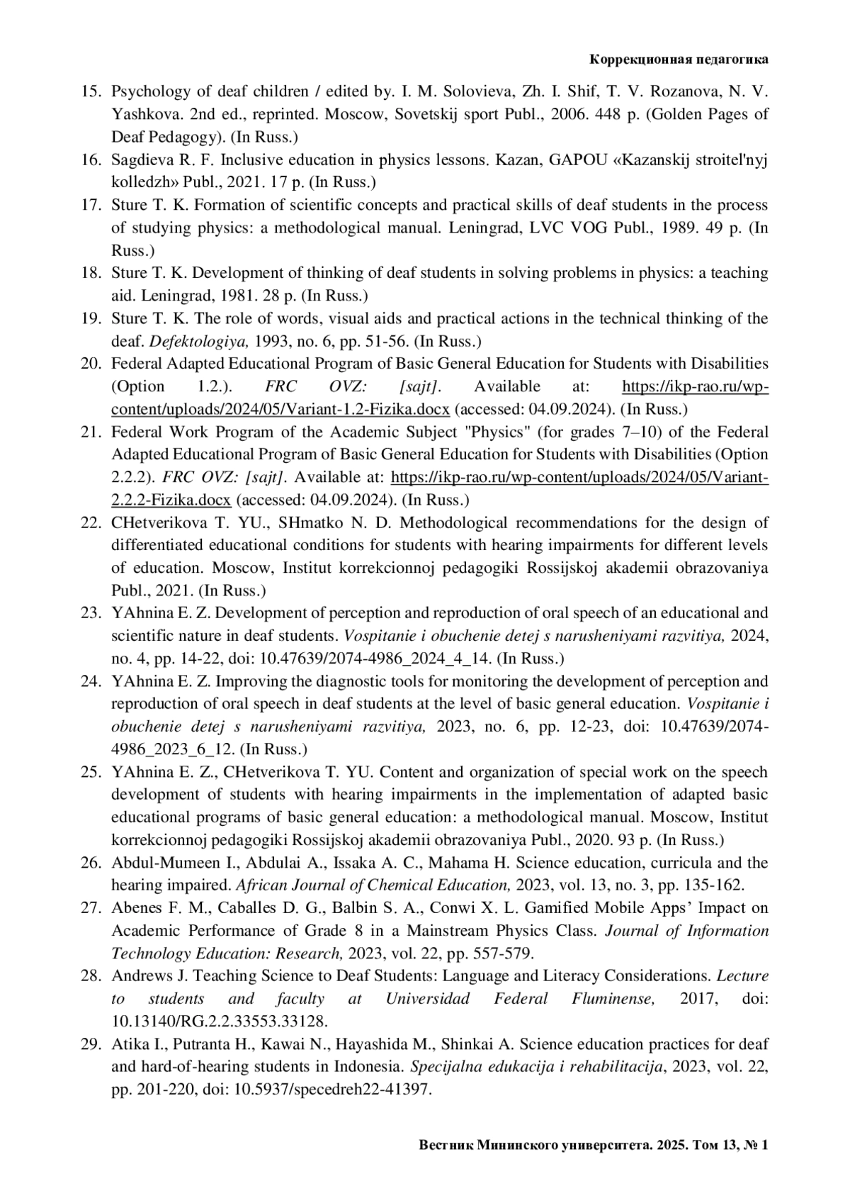 29. Atika I., Putranta H., Kawai N., Hayashida M., Shinkai A. Science education practices for deaf and hard-of-hearing students in Indonesia // Specijalna edukacija i rehabilitacija. 2023. Vol. 22. Pp. 201-220. https://doi.org/10.5937/specedreh22-41397.