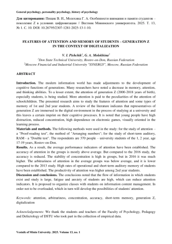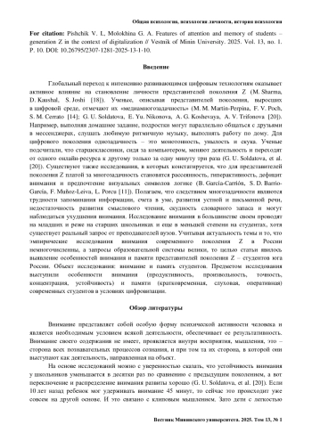 Введение. Современный информационный мир внес коррективы в развитие познавательных функций поколений. Многие исследователи отмечают снижение памяти, внимания, мыслительных способностей. В меньшей степени изучается внимание поколения Z (2000– 2018 годы рождения), особенно студентов. Больше внимание уделяется особенностям внимания школьников. Обзор литературы свидетельствует о том, что представители поколения Z погружены в цифровую среду в процессе обучения в вузе и это накладывает определенный отпечаток на их познавательные процессы. Отмечается, что у молодых высока отвлекаемость, снижена концентрация внимания, большая зависимость от электронных игр, они визуально ориентированы в процессе обучения.