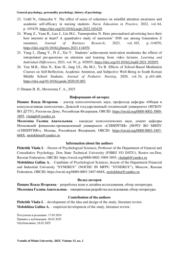 26. Yun M.R., Shin N., Kim H., Jang I.S., Ha M.J., Yu B. Effects of School-Based Meditation Courses on Self-Reflection, Academic Attention, and Subjective Well-Being in South Korean Middle School Students // Journal of Pediatric Nursing. 2020. Vol. 54. P. e61-e68. https://doi.org/10.1016/j.pedn.2020.05.002.