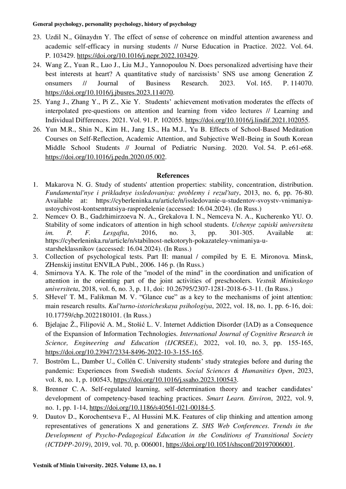 23. Uzdil N., Günaydın Y. The effect of sense of coherence on mindful attention awareness and academic self-efficacy in nursing students // Nurse Education in Practice. 2022. Vol. 64. P. 103429. https://doi.org/10.1016/j.nepr.2022.103429.