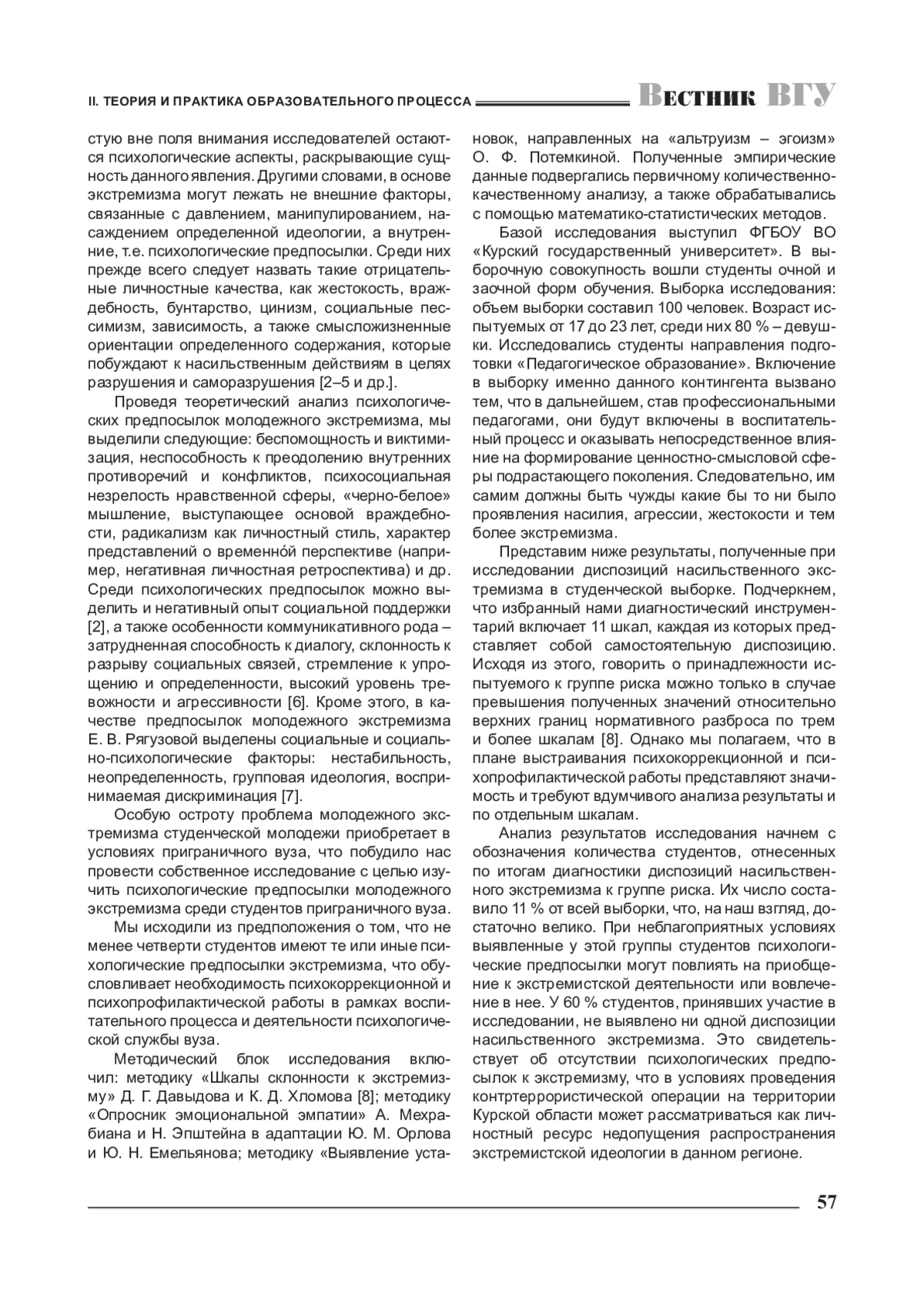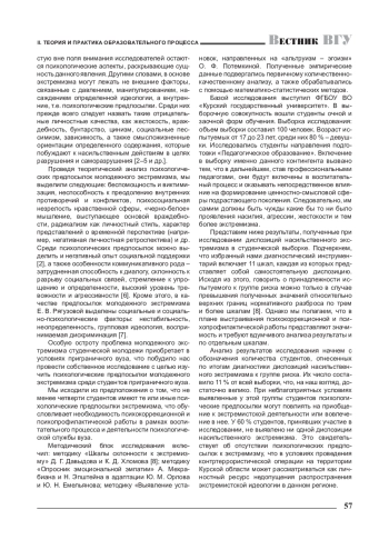 Особую остроту проблема молодежного экстремизма студенческой молодежи приобретает в условиях приграничного вуза, что побудило нас провести собственное исследование с целью изучить психологические предпосылки молодежного экстремизма среди студентов приграничного вуза. Мы исходили из предположения о том, что не менее четверти студентов имеют те или иные психологические предпосылки экстремизма, что обусловливает необходимость психокоррекционной и психопрофилактической работы в рамках воспитательного процесса и деятельности психологической службы вуза.