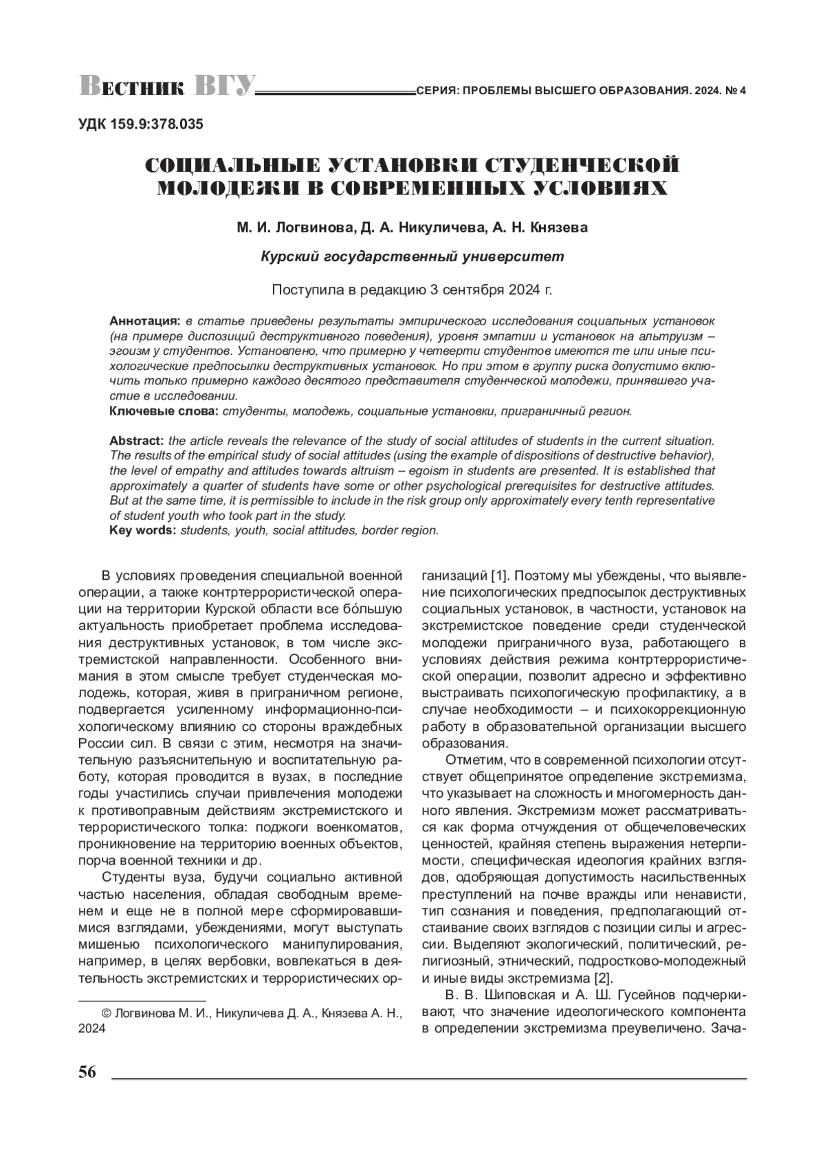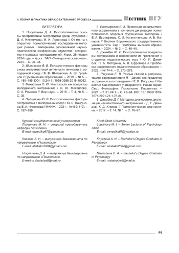 1. 	Никуличева Д. А. Психологические основы профилактики экстремизма среди студентов / Д. А. Никуличева, М. И. Логвинова // От мечты к открытию: психологические исследования молодых ученых: материалы региональной научнопрактической конференции студентов, аспирантов и молодых преподавателей, Курск, 26 января 2024 года. - Курск: ЗАО “Университетская книга”, 2024. - С. 95-98.