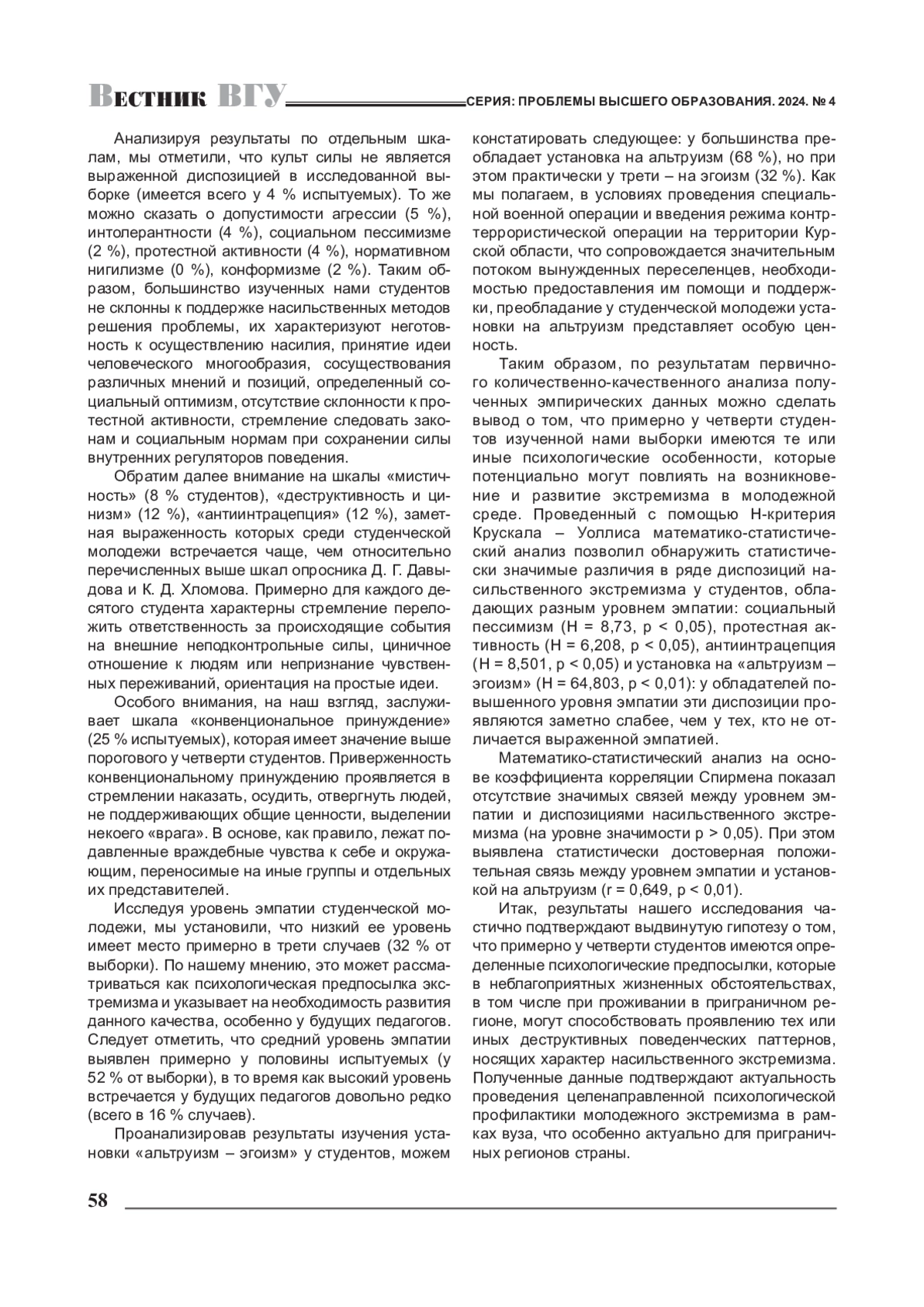 5. 	Евстифеева Е. А. Превенция насильственного экстремизма в контексте депривации психологического здоровья студенческой молодежи / Е. А. Евстифеева, С. И. Филиппченкова, А. В. Макаров // Вестник Воронежского государственного университета. Сер.: Проблемы высшего образования. - 2024. - № 2. - С. 40-45. EDN: GGQRGC