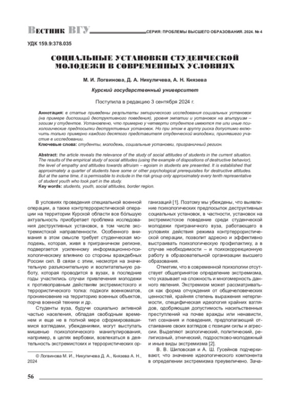 В статье приведены результаты эмпирического исследования социальных установок (на примере диспозиций деструктивного поведения), уровня эмпатии и установок на альтруизм -эгоизм у студентов. Установлено, что примерно у четверти студентов имеются те или иные психологические предпосылки деструктивных установок. Но при этом в группу риска допустимо включить только примерно каждого десятого представителя студенческой молодежи, принявшего участие в исследовании.