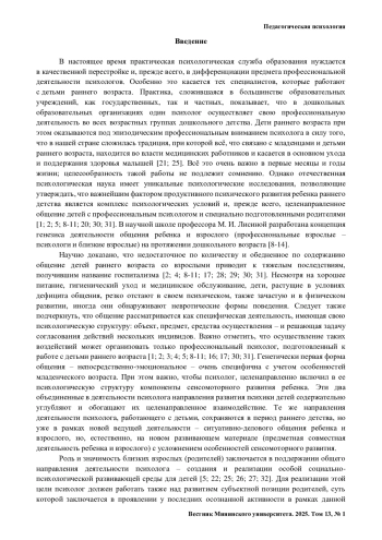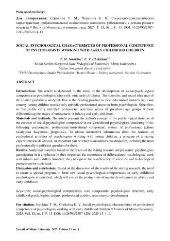Введение. Статья посвящена изучению развития социально-психологической компетенции психологов, работающих с детьми раннего возраста. Анализируется научная и социальная актуальность изучаемой проблемы. В силу сложившейся практики, существующей в большинстве образовательных учреждений в нашей стране, дети раннего возраста оказываются под эпизодическим профессиональным вниманием психолога. Специалист данного профиля осуществляет свою профессиональную деятельность во всех возрастных группах дошкольного детства без дифференцирования этапов онтогенеза младенческого и раннего возраста.