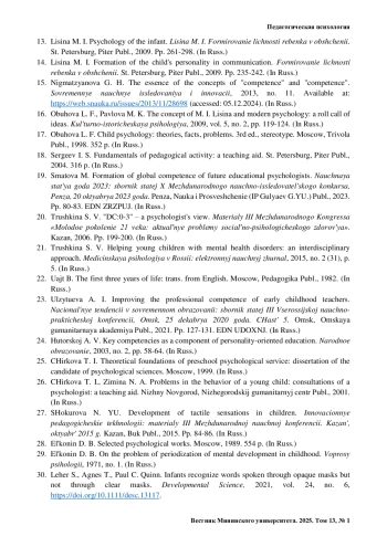 12. Лисина М. И. Особенности общения у детей раннего возраста в процессе действий, совместных со взрослым // Развитие общения у дошкольников / под ред. А. В. Запорожца, М. И. Лисиной. М.: Педагогика, 1974. С. 113-154.