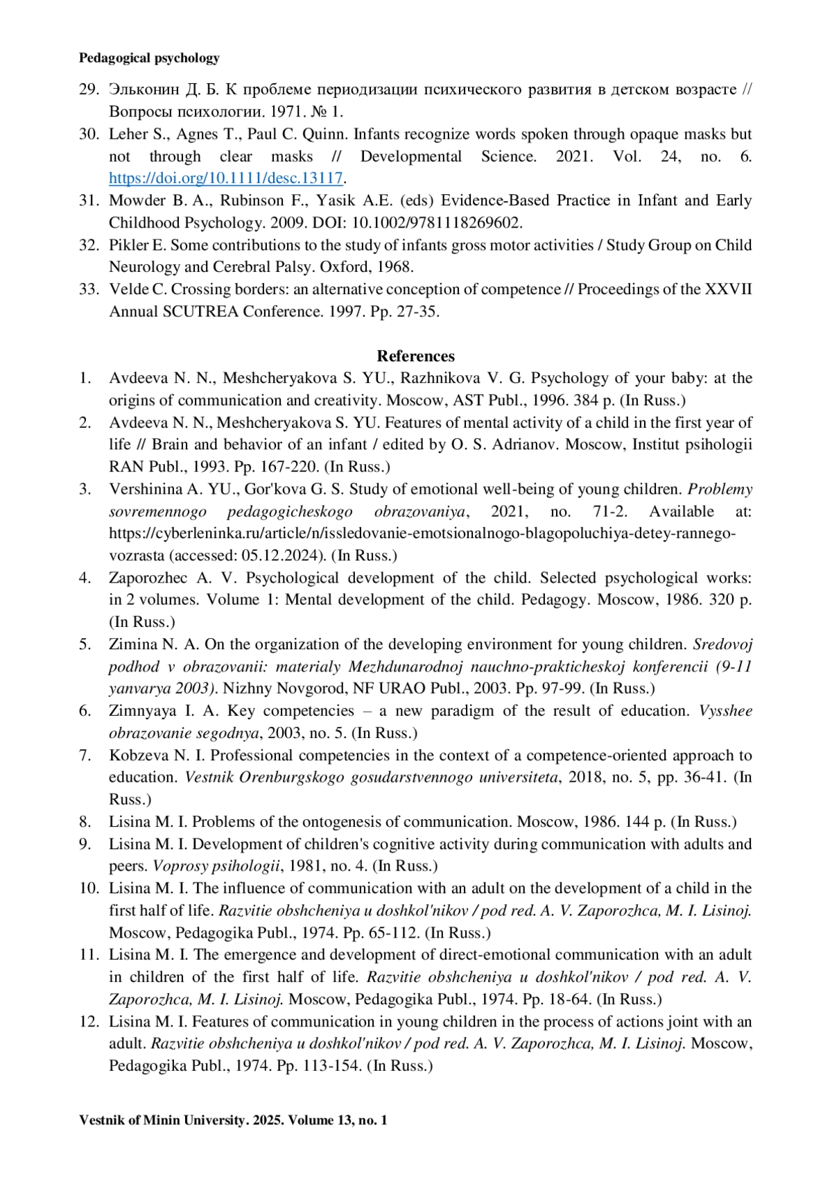 2. Авдеева Н. Н., Мещерякова С. Ю. Особенности психической активности ребенка первого года жизни // Мозг и поведение младенца / под ред. О. С. Адрианова. М.: Институт психологии РАН, 1993. С. 167-220.