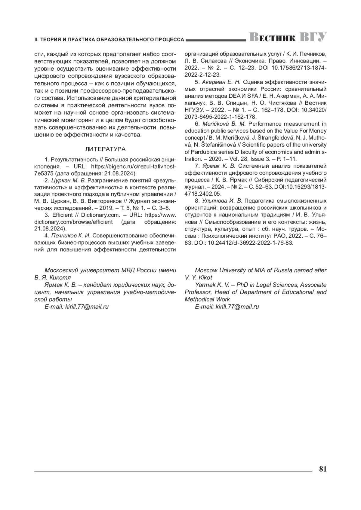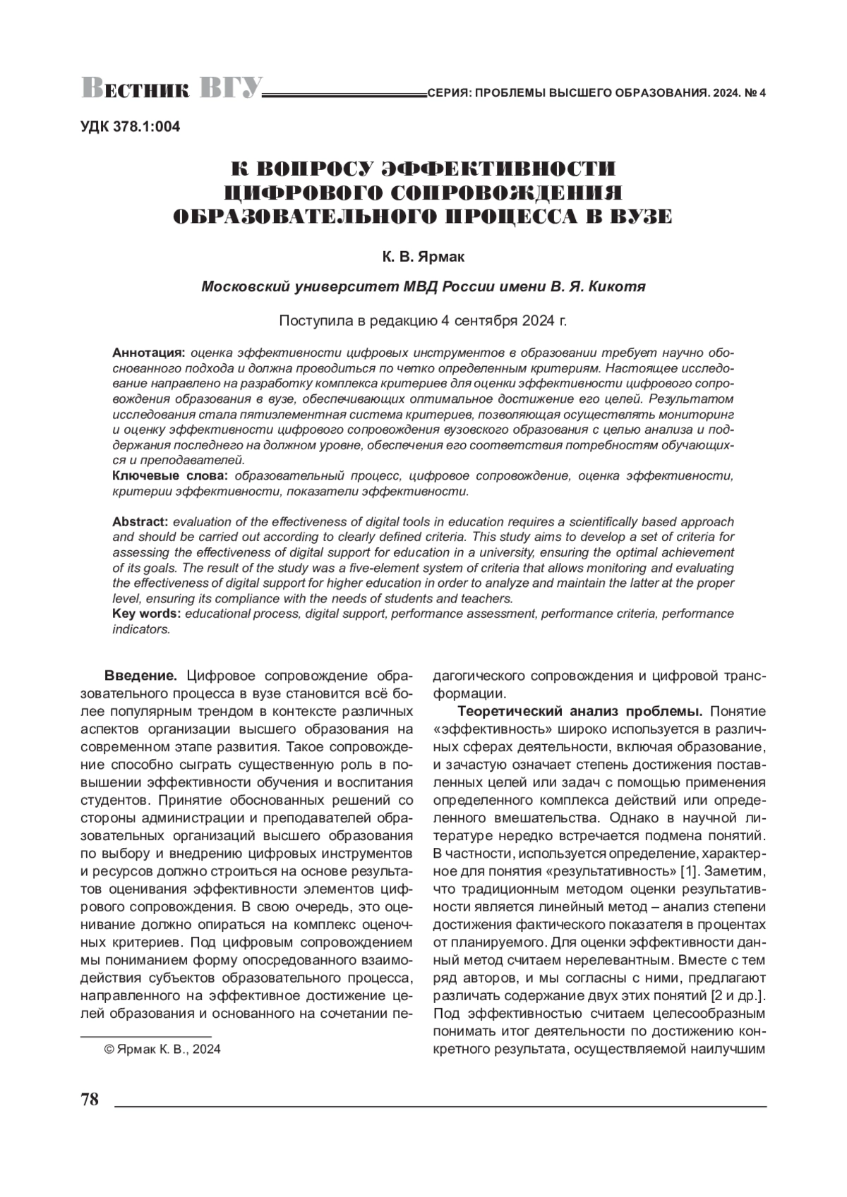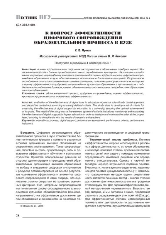 7. 	Ярмак К. В. Системный анализ показателей эффективности цифрового сопровождения учебного процесса / К. В. Ярмак // Сибирский педагогический журнал. -2024. - № 2. - С. 52-63. DOM0.15293/1813-4718.2402.05. EDN: BPIAPG