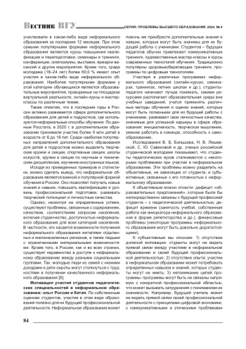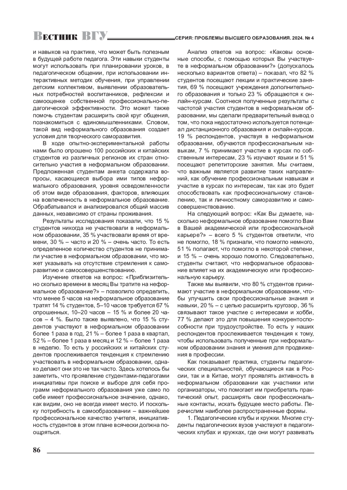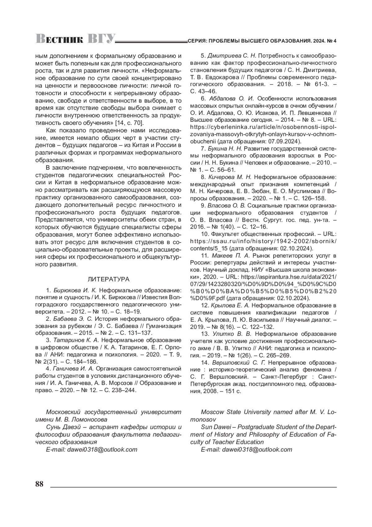 В статье рассматриваются особенности участия студентов педагогических специальностей России и Китая в неформальном образовании, мотивация выбора ими направлений и форм такого вида образования, роль дополнительных компетенций, получаемых в ходе неформального образования, в профессиональном развитии будущих педагогов. Проанализирована также работа студентов - будущих педагогов - в качестве репетиторов, которую автор относит к одному из видов неформального образования. Сделан вывод о наличии ряда общих черт в участии российских и китайских студентов в неформальном образовании.